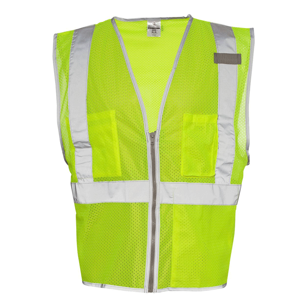 Make sure safety is company policy with the ML Kishigo Men's Lime Premium Brilliant Series Three-Pocket Zippered Mesh Vest. Workwear needs to be functional and durable and this ultra-cool 100% polyester mesh vest delivers. As far as industrial apparel is defined, this vest is a must have for the safety conscious company that wants workers to get noticed. The 2 inch wide high performance reflective material and edging improves low light visibility. A left chest mic tab, radio pocket, and inside lower left chest pocket allow easy access to your necessary items.