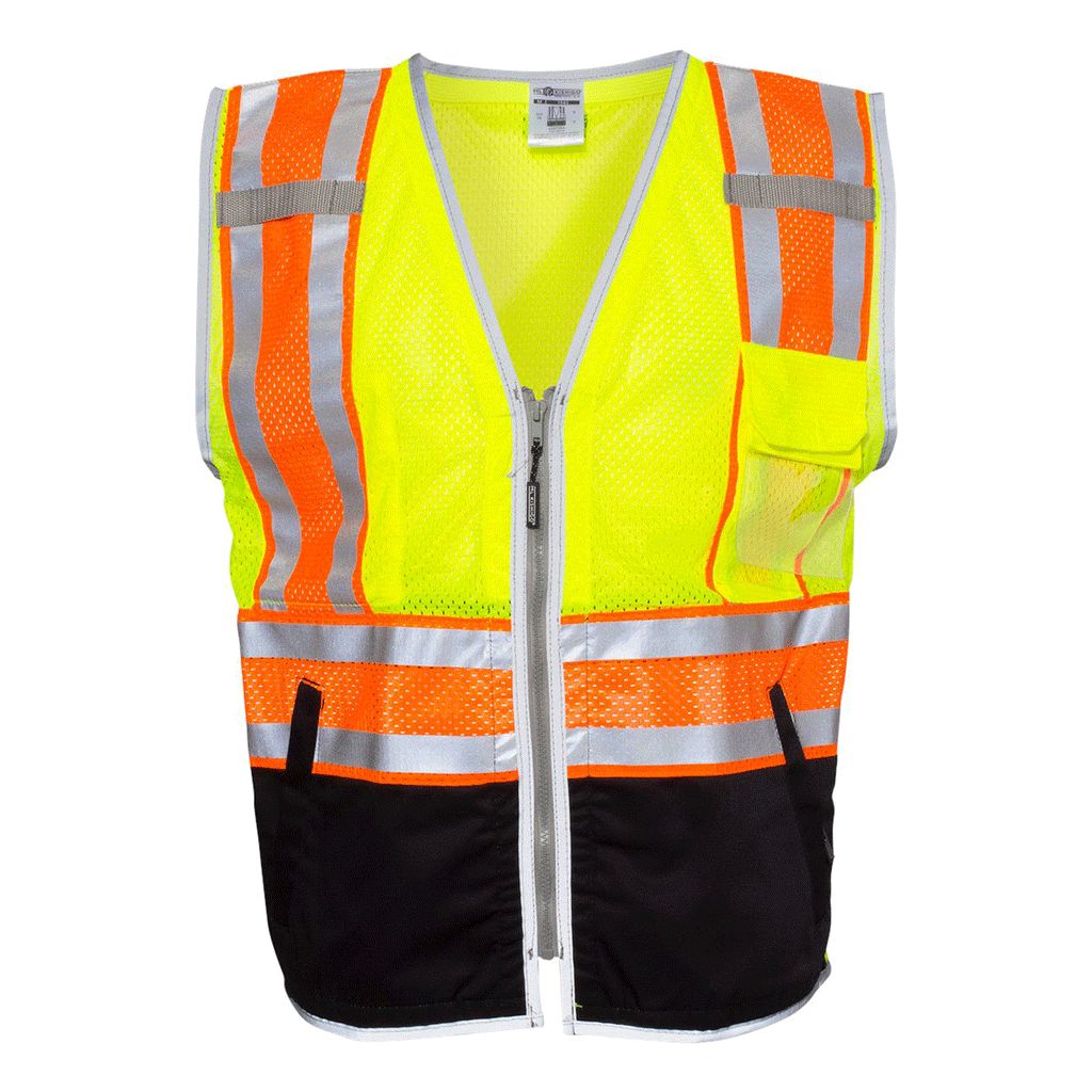 Get noticed in the ML Kishigo Men's Lime Ultimate Reflective Vest that is made for those who need workwear that is breathable, yet safety conscious. Made of Ultra-Cool 100% polyester mesh with a heavy duty black bottom front, this bright vest has a plastic zipper front closure that is reinforced with durable webbing for long term wear. Reflective material with contrasting color enhances visibility during low light and nighttime hours. As far as industrial apparel is concerned this vest has it all. Small details like left and right chest mic tabs, left radio pocket, clear ID holder, and lower slash pockets make a huge difference.Highlights