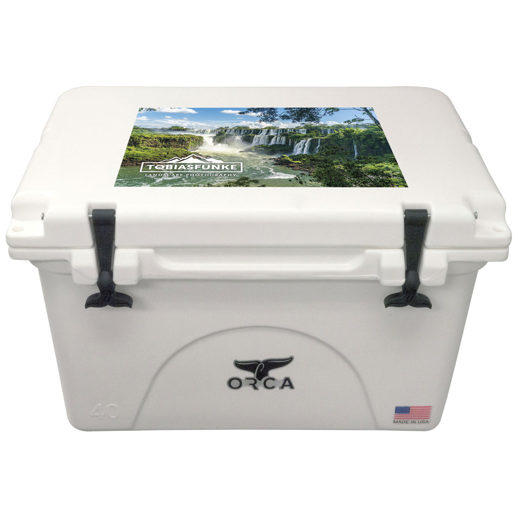 Need a custom cooler for rugged adventures? The ORCA White 40 Quart Cooler that we have here is specially designed with a roto-molded construction and is incredibly durable - tough enough to protect your favorite beverages from bears and other unwanted animals (when used with a padlock). The Quart 40 can keep up to 48 cans cool for 10 days. Personalize the cooler with your custom logo and you'll be able to use it as an employee gift or prize at an event raffle.