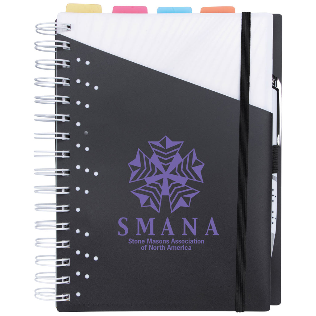 - Plastic color notebook, vertex pen inserted into elastic pen loop, unimprinted, 4 subject dividers with colored tabs and an interior pocket