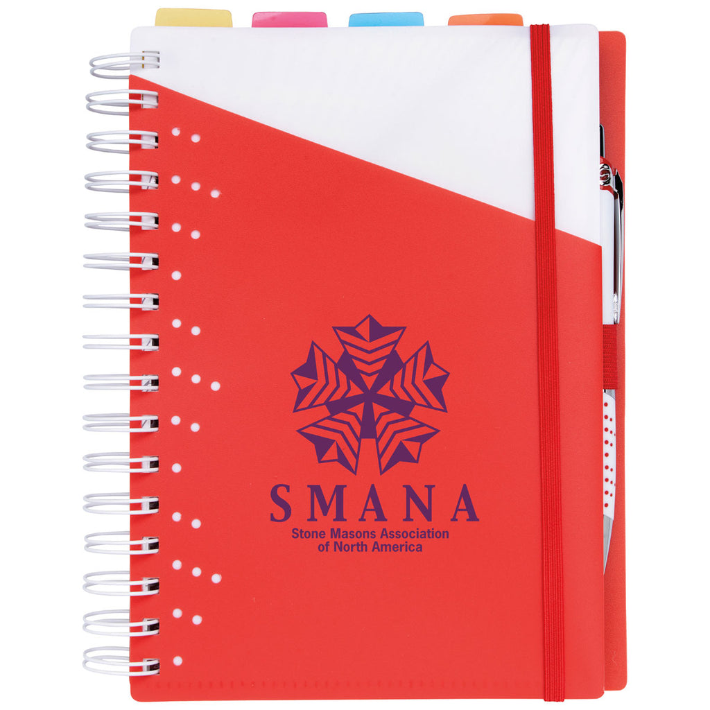 • Plastic color notebook, vertex pen inserted into elastic pen loop, unimprinted, 4 subject dividers with colored tabs and an interior pocket