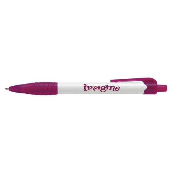 Add character to your promotional campaigns with the Hub Pens White/Purple Palmiro Pen available in vibrant trim colors. It features a push-action retractable mechanism and embodies a white barrel that will show off your company's logo or name loud and clear. Ribbed grip ensures lasting comfort while you're tracking the events that happen in a day.