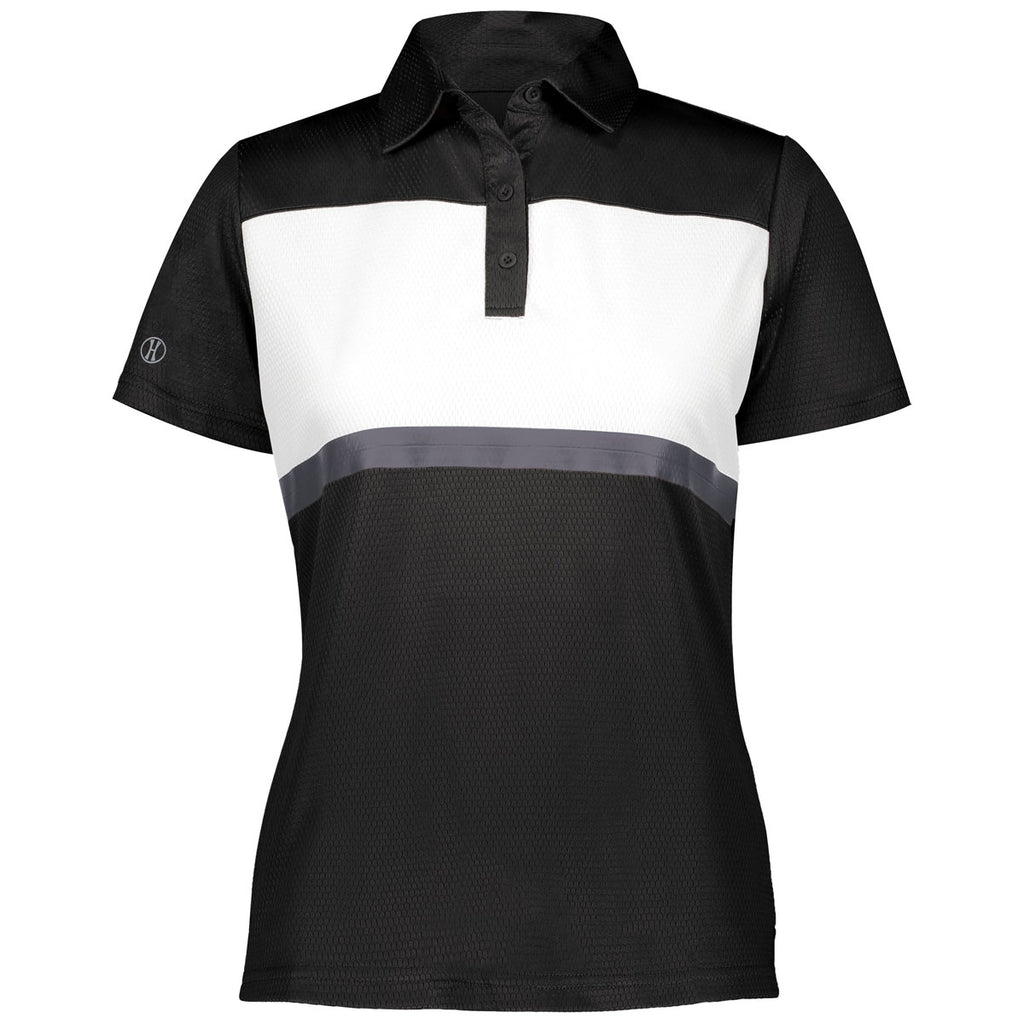 Holloway Women's Black/White Prism Bold Polo with embroidery is a great look as part of uniforms or employee apparel with your company logo. The lightweight polyester wicking honeycomb knit provides a feminine fit with UPF 50+ for added protection. The accents at the chest helps this polo stand out in a crowd and get you noticed. Try out a custom logo to add this polo to your logoed apparel options and watch as they become a popular sales item. The feminine fit with self-fabric collar, three-button placket, and set-in sleeves is a great addition to every wardrobe. Place an order today.Corresponding Men's Style:Holloway Men's Black/White Prism Bold Polo