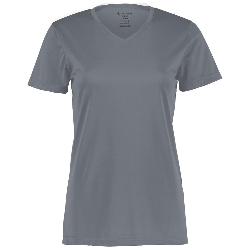 Custom screen print will pop on the Holloway Women's Graphite Momentum Tee. This simple, straightforward tee is a must have as daily comfort wear that can be dressed up or down as needed. A basic tee is a wardrobe staple that can serve many purposes. Add a company logo to use as part of a uniform or a custom design to show affiliation with a group, club, or team. The feminine fitting tee is color secure, wicks moisture, and is odor resistant with V-neck collar and set-in sleeves. The possibilities are endless with this tee, so place your order right away.Corresponding Men's Style:Holloway Men's Graphite Momentum Tee