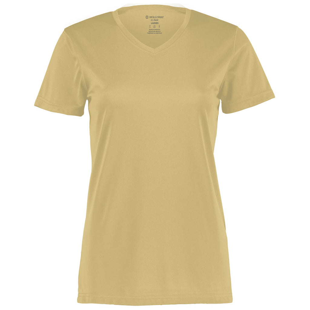 Custom screen print will pop on the Holloway Women's Vegas Gold Momentum Tee. This simple, straightforward tee is a must have as daily comfort wear that can be dressed up or down as needed. A basic tee is a wardrobe staple that can serve many purposes. Add a company logo to use as part of a uniform or a custom design to show affiliation with a group, club, or team. The feminine fitting tee is color secure, wicks moisture, and is odor resistant with V-neck collar and set-in sleeves. The possibilities are endless with this tee, so place your order right away.Corresponding Men's Style:Holloway Men's Vegas Gold Momentum Tee