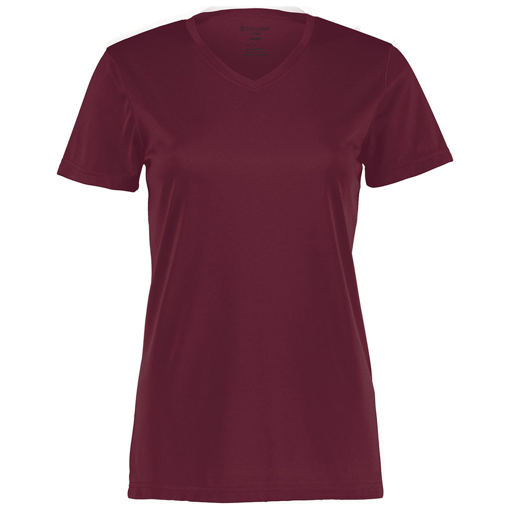 Custom screen print will pop on the Holloway Women's Maroon Momentum Tee. This simple, straightforward tee is a must have as daily comfort wear that can be dressed up or down as needed. A basic tee is a wardrobe staple that can serve many purposes. Add a company logo to use as part of a uniform or a custom design to show affiliation with a group, club, or team. The feminine fitting tee is color secure, wicks moisture, and is odor resistant with V-neck collar and set-in sleeves. The possibilities are endless with this tee, so place your order right away.Highlights