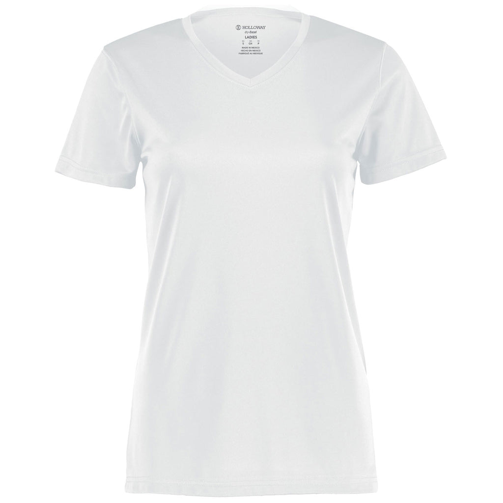 Custom screen print will pop on the Holloway Women's White Momentum Tee. This simple, straightforward tee is a must have as daily comfort wear that can be dressed up or down as needed. A basic tee is a wardrobe staple that can serve many purposes. Add a company logo to use as part of a uniform or a custom design to show affiliation with a group, club, or team. The feminine fitting tee is color secure, wicks moisture, and is odor resistant with V-neck collar and set-in sleeves. The possibilities are endless with this tee, so place your order right away.Corresponding Men's Style:Holloway Men's White Momentum Tee