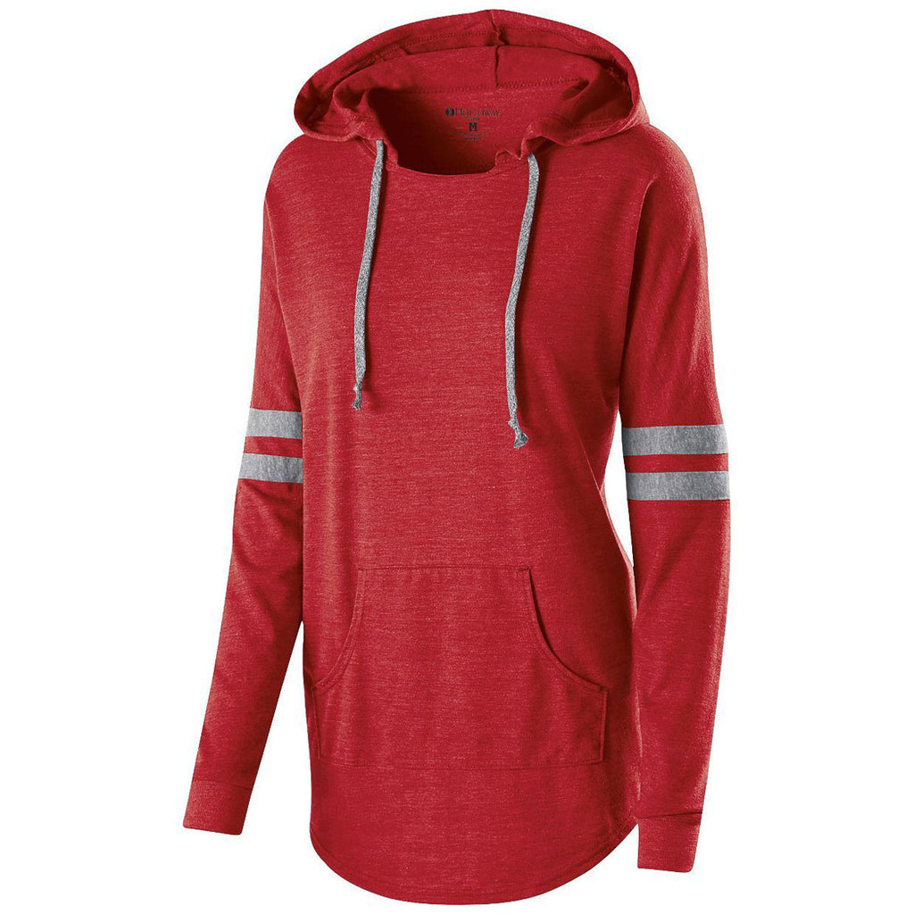 Holloway Women's Vintage Scarlet/Vintage Grey Hooded Low Key Pullover with screen print design is ideal for days when you just want to be comfortable. The tri-blend vintage heather, long-sleeve pullover is lightweight in a feminine fit with a raw edge neckline which makes it a perfect employee gift. Raglan sleeves with contrast color sleeve stripes stand out with the longer length contoured bottom for coverage and comfort. Add a custom logo to this hoodie to add to your logoed apparel line with an all around hoodie that will be a fast hit. Place an order today to have these as soon as possible.Highlights