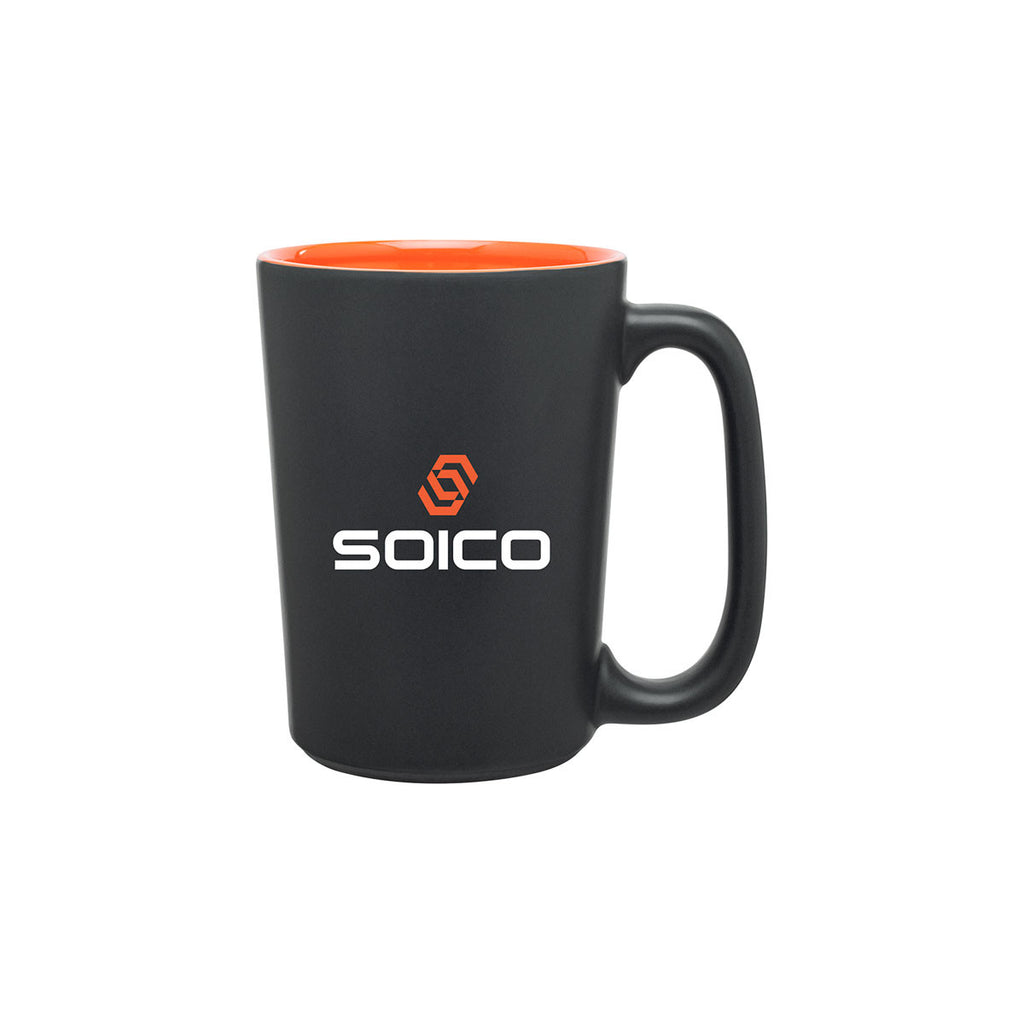 Enjoy your favorite beverage in this ETS Rocca Black/Glossy Orange Ceramic Mug 12 oz. It flaunts a matte black exterior and glossy contrast interior. This stoneware will make a perfect promotional mug for an imprint of a bright, striking logo or brand message as the sign will stand out against the dark backdrop.