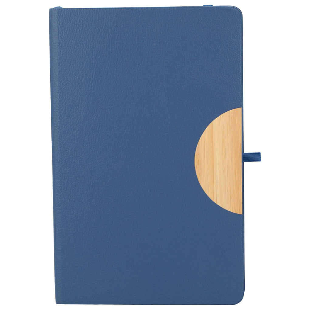 Order the JournalBooks Navy Kaya Recycled and Bamboo Notebook for a sustainable upgrade to your office stationery. This eco-friendly journal features a recycled polyurethane (PU) cover and a bamboo accent. It has an elastic closure, ribbon page marker, pen loop, and a back paper document pocket for added functionality. Add a custom-printed logo to match corporate branding.
