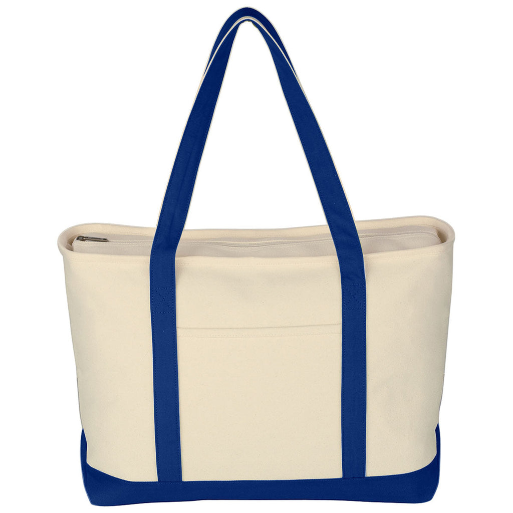 Enjoy the Hit Natural/Royal Blue Large Starboard Cotton Canvas Tote Bag with a custom logo. This neutral color bag has a bottom panel and shoulder straps in several color options to fit your needs. The ideal option for the beach, park, or road trip, the roomy tote zips closed for convenience. Give as a gift or add to your logoed items for sale.