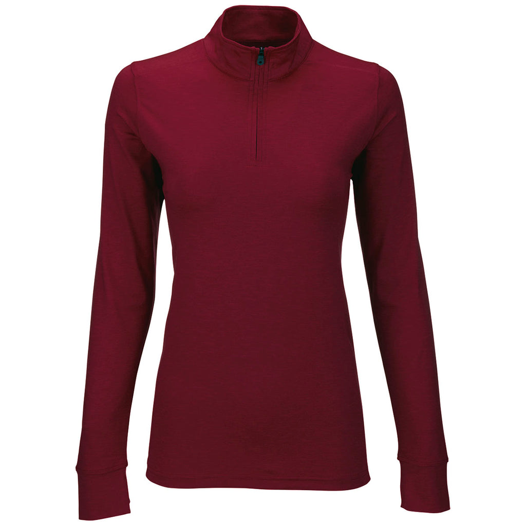 With forward shoulders in addition to front and back princess seams, the logoed Vansport Women's Deep Maroon Zen Pullover defines the elegant appearance you need to get noticed at company sponsored golf tournaments. Moisture management technology makes the pullover perfect to wear when Mother Nature kicks up the humidity. The mostly polyester outerwear material resists rips and tears making it the perfect go to golf pullover for years to come. A little bit of spandex increases your arm movement flexibility to allow you more flexibility while teeing off. Attach a custom logo on the large imprint area and watch awareness of your company reach a new level.