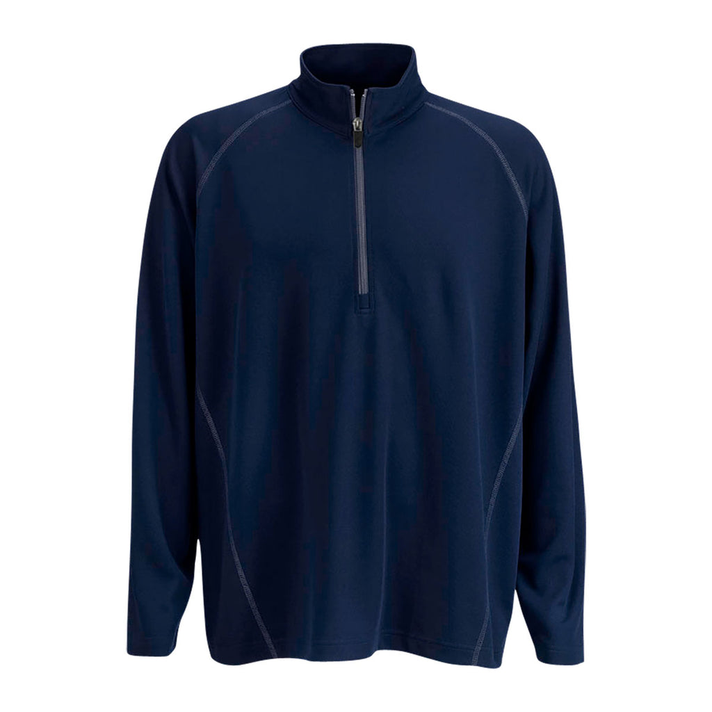 Vantage gives new meaning to the term high performance by introducing the company logoed Vantage Men's Navy Performance Pullover. Designed with twill knit, the pullover contains highly durable polyester that enables the fabric to remain in pristine condition for years to come. The quarter-zip neck and contrast zipper complement triple-needle stitching to produce a chic corporate gift for your loyal customers. Wear the high performance pullover as an outer layer and as the middle layer between a Vantage tee and winter jacket. Add a custom logo on the large imprint area to wow customer prospects at business conferences.Corresponding Women's Style: Vantage Women's Navy Performance Pullover