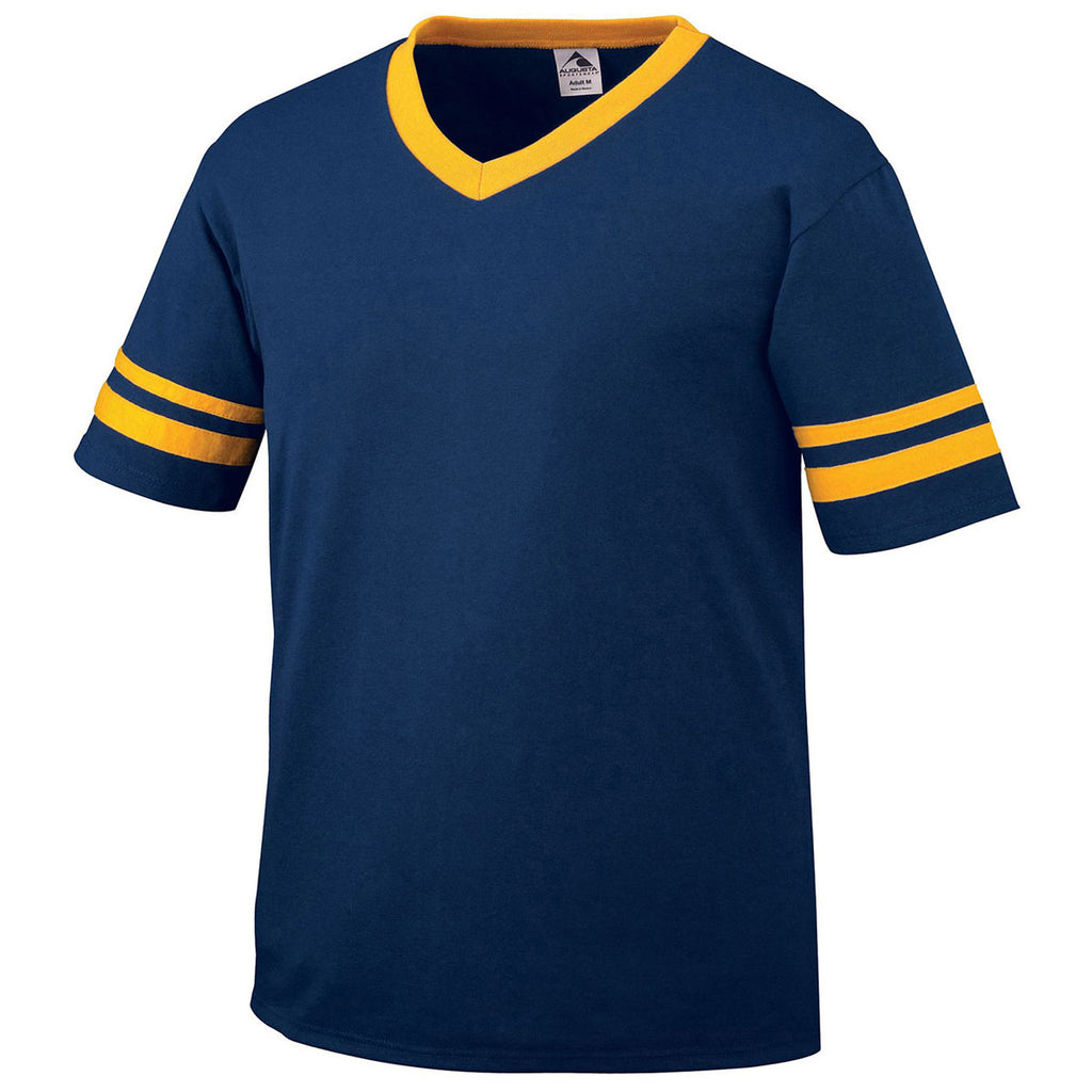 The stylish custom Augusta Sportswear Men's Navy/Gold Sleeve Stripe Jersey will look even better with your corporate logo affixed to it. Available in 33 unique colors, the men's jersey includes features such as a 50/50 polyester/cotton jersey knit, contrast color v-neck collar, contrast color sleeve stripes, double-needle hem sleeves and bottom, and other enticing attributes. Add a screen print company logo to the front of this jersey and you have a wonderful way to advertise your company name. This jersey shirt will make a great employee apparel gift or a lovely giveaway item at upcoming golf events or recruiting events.Highlights