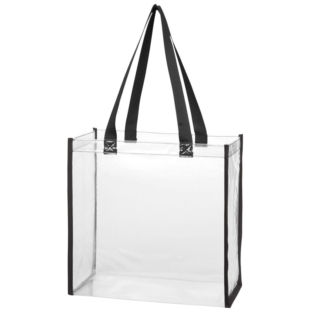 Be concert-ready with a Hit Clear with Black Trim Clear Tote Bag with a corporate logo. This see-thru tote is large enough for all your necessities and a few extras, making it perfect for school, the office, or concerts where all bags must be transparent. The colorful seams and shoulder straps add a pop of color to get you noticed.