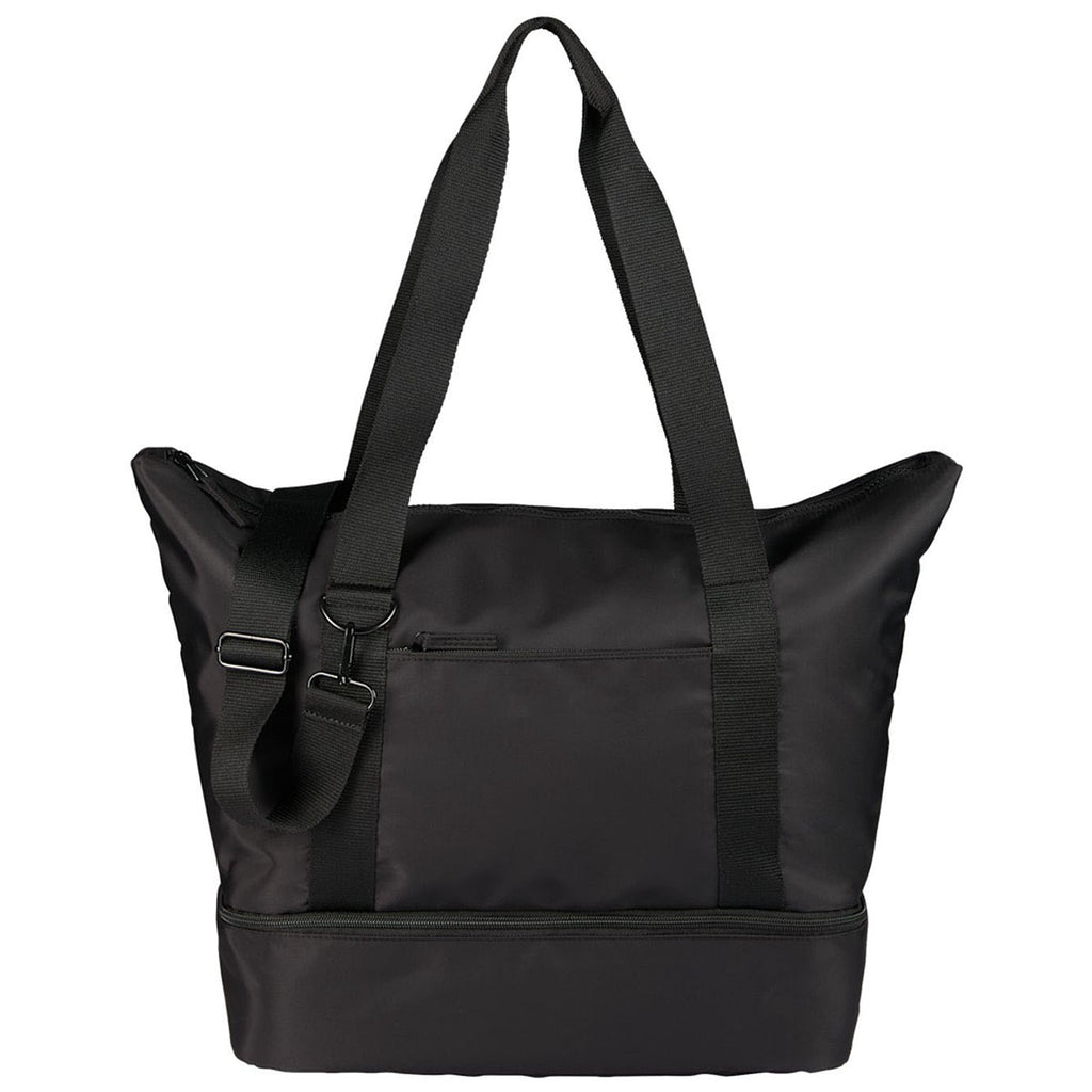 Choose a custom design for the Leed's Black Daybreak Recycled Travel Tote to enjoy an easy-to-carry bag for outdoor adventures. This spacious tote is ideal for snacks on long car rides or toys while visiting the beach. A zippered bottom compartment easily holds shoes or bulky items, and an inside laptop pocket means you can work from anywhere.