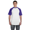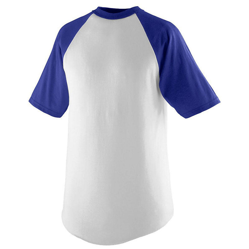 Attach your company logo to Augusta Sportswear Men's White/Purple Short-Sleeve Baseball Jersey for a stylish shirt, perfect for a day at the park or as employee apparel for the company softball team. Available in 16 different colors, choose the right color tone to match your company logo. Features of this must-have clothing item include a comfortable 50/50 cotton/polyester jersey knit fabric, contrasting color sleeves, double-needle hem sleeves, and fishtail bottom. Purchase this shirt as corporate apparel and add your screen print company logo to the front of the shirt for the perfect finishing touch.