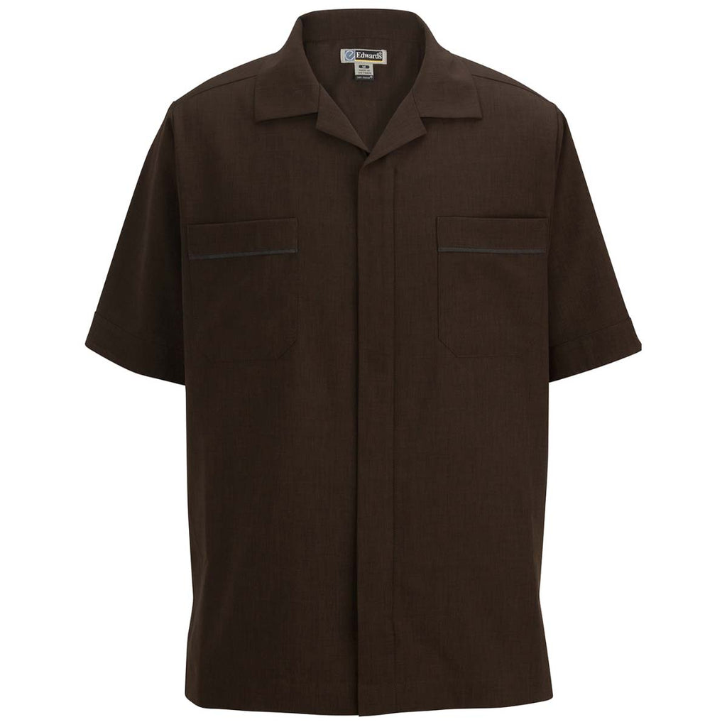 Add a custom embroidery to the Edwards Men's Chocolate Pinnacle Service Shirt to create a look unique to your company or organization. Made of 100% polyester the contemporary styling of this comfortable to wear, easily washable shirt is unmatched. Available in six color combinations this service shirt is ideal as part of employee apparel when paired with slacks or as corporate uniforms for large organizations. The hidden placket with zipper down front with snap closure ensures a tidy appearance on the short sleeve shirt with contrasting piping on the pockets.Highlights
