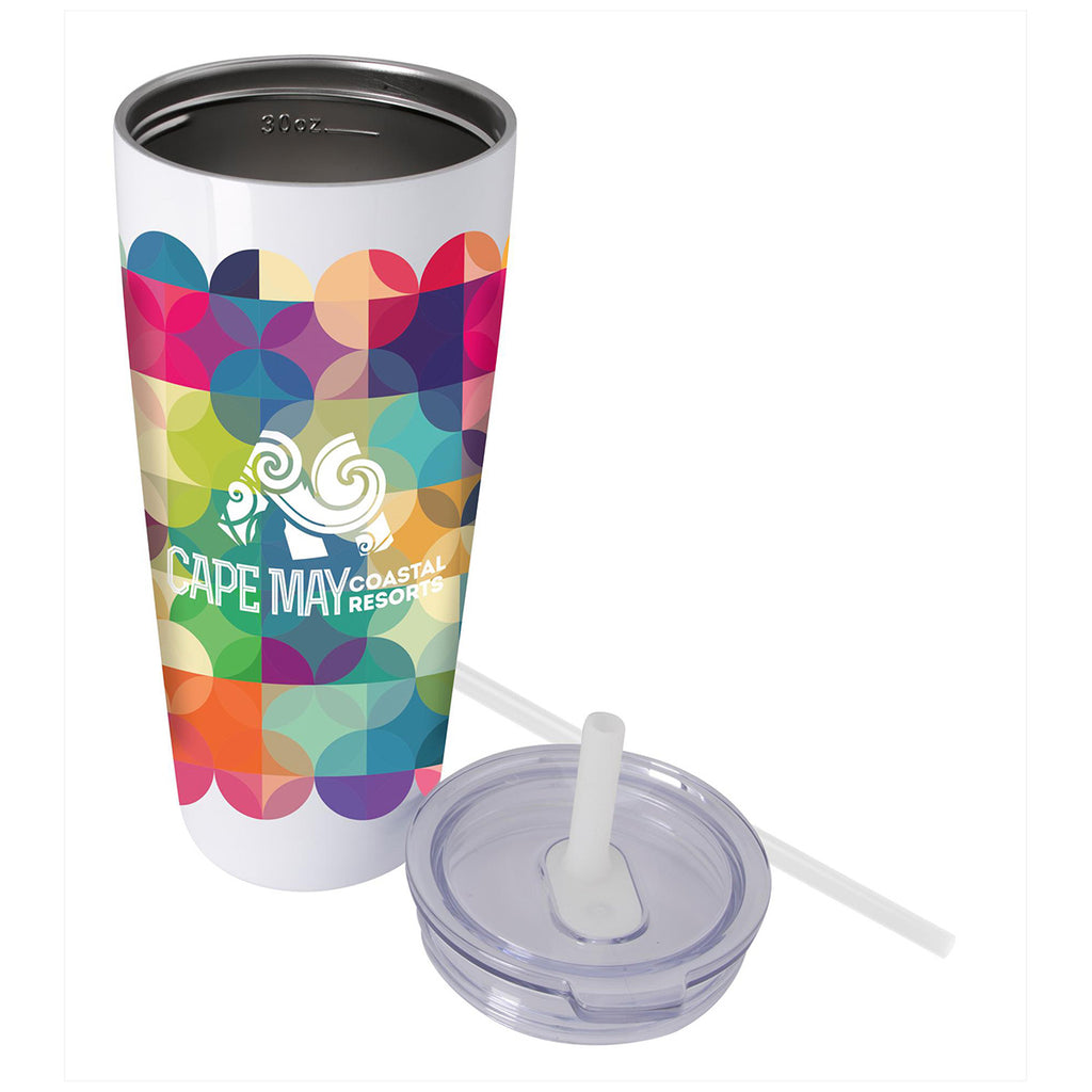 Koozie Glossy White Built-in Straw Vacuum Tumbler - 30 oz. with your custom design is a wonderful gift to share with clients and friends as needed. The large tumbler is spill-proof, and the straw is built in, so there is no more waste. Enjoy all of your favorite beverages on the go, whether headed to work, on a trip, or just about town. Order today.The minimum order for this product is 48 pieces.
