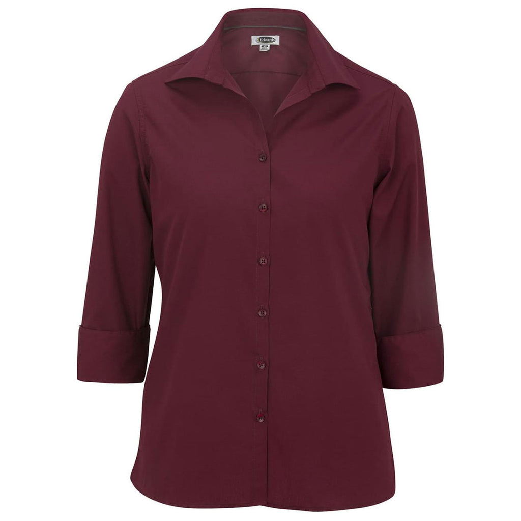 Your company logo will pop on the Edwards Women's Burgundy Lightweight Poplin Shirt made of lightweight polyester and cotton. The 3/4 sleeve blouse has an open neck with contoured side seams and back darts making it fashionable enough to be used as corporate apparel. Machine washable and wrinkle resistant means all day wear of this shirt will still have you looking and feeling great. Try out a custom logo to use at special events or to show support for a specific organization. The simple button-up is stylish and easy to care for no matter what your day holds.
