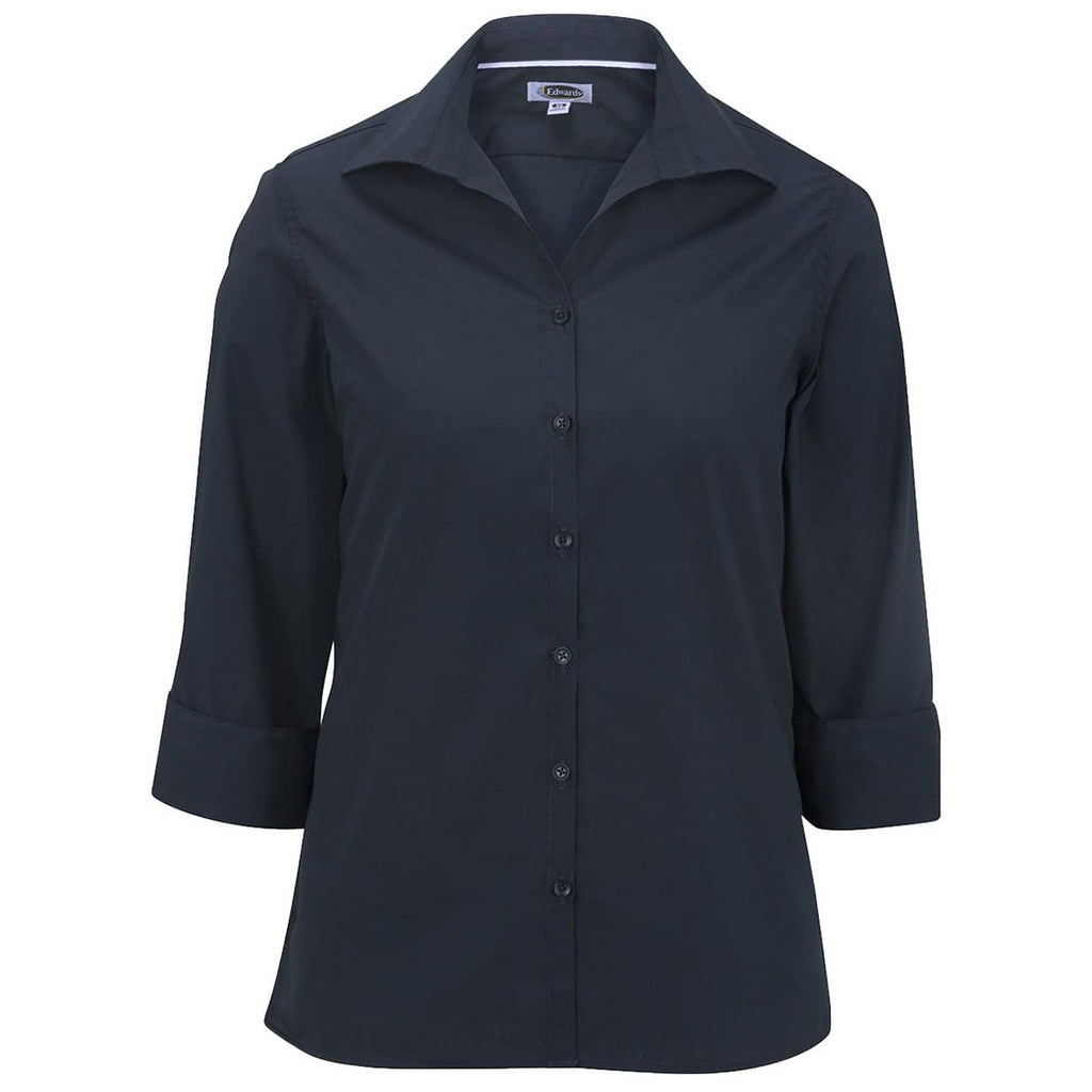 Your company logo will pop on the Edwards Women's Navy Lightweight Poplin Shirt made of lightweight polyester and cotton. The 3/4 sleeve blouse has an open neck with contoured side seams and back darts making it fashionable enough to be used as corporate apparel. Machine washable and wrinkle resistant means all day wear of this shirt will still have you looking and feeling great. Try out a custom logo to use at special events or to show support for a specific organization. The simple button-up is stylish and easy to care for no matter what your day holds.