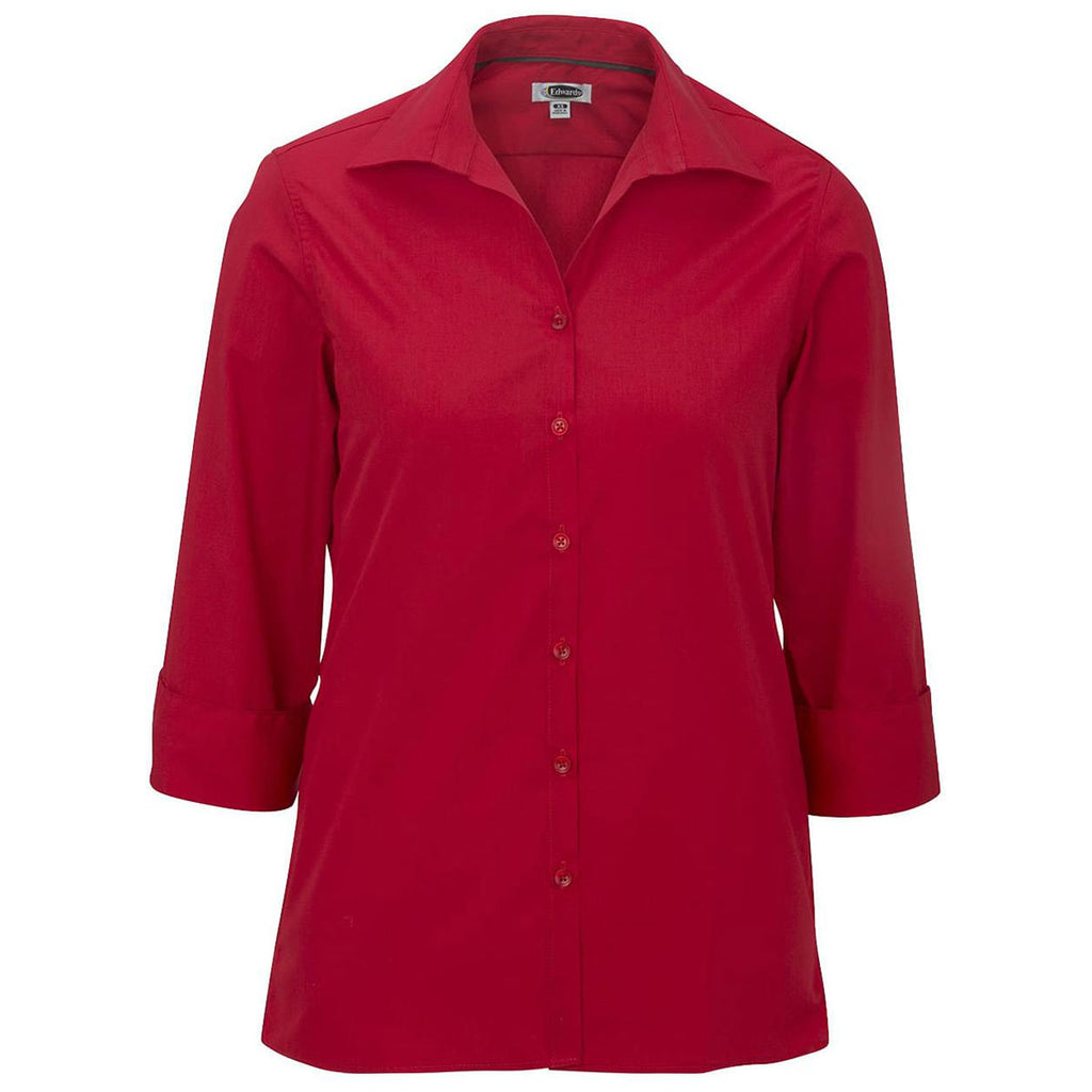Your company logo will pop on the Edwards Women's Red Lightweight Poplin Shirt made of lightweight polyester and cotton. The 3/4 sleeve blouse has an open neck with contoured side seams and back darts making it fashionable enough to be used as corporate apparel. Machine washable and wrinkle resistant means all day wear of this shirt will still have you looking and feeling great. Try out a custom logo to use at special events or to show support for a specific organization. The simple button-up is stylish and easy to care for no matter what your day holds.Highlights