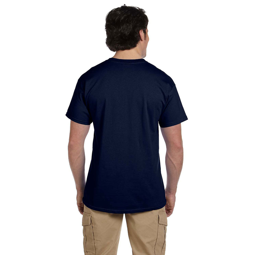 Practice being green in this custom Hanes Men's Navy 5.2 oz. 50/50 EcoSmart T-Shirt with the screen print of your choosing. Ideal for use as employee apparel as your workers will be comfortable all day in the cotton and polyester blend that contains up to 5% recycled polyester to help the planet. Make a statement at your next trade show or recruiting event with these company screen print tees that will be wanted by all. Also perfect for company outings or team sports in which knowing who is on your team is important. Place your order today for one of the 33 available colors.Highlights