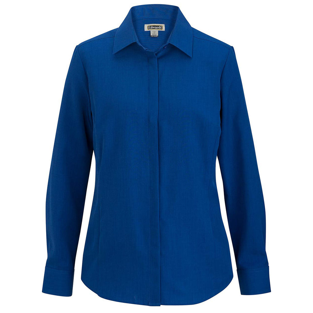 Create a custom updated look with the Edwards Women's Cobalt Batiste Cafe Shirt in a range of classic colors. Offering a flattering fit in an understated style, this 100% polyester shirt is perfect for those who need employee apparel that demonstrates professionalism. Add a corporate embroidery to the long sleeve button up with two button adjustable cuff and narrow collar with hidden placket. Ideal for layering with a suit jacket as part of corporate uniforms the shirt is wrinkle resistant, offers soil release, and moisture wicking. Your custom logo will look beautiful on these shirts that offer the ability to be paired with jeans, slacks, or almost any type of attire you can imagine.Highlights