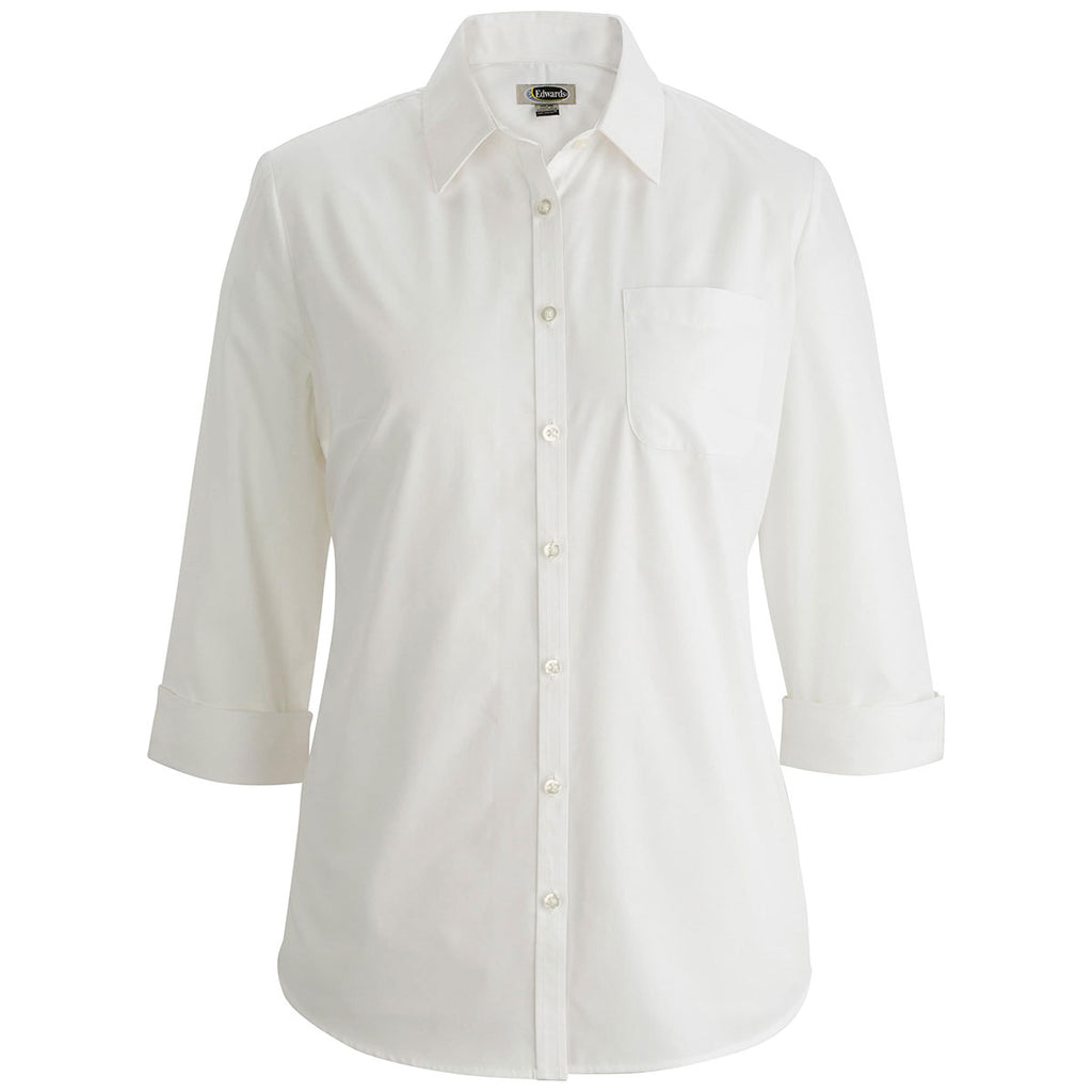 Up your uniform game with the embroidered Edwards Women's White Essential Broadcloth Blouse. This lightweight polyester rich cotton blend has an improved fit that makes it ideal as employee apparel with a company logo. The performance broadcloth shirt is made for comfort with a point collar with permanent stays, 3/4 sleeve with adjustable cuff, and straight back yoke seam. Wrinkle resistant, this button up will keep you looking and feeling great whether serving customers or leading a meeting. Wear alone or pair with a jacket to create a custom look.Highlights