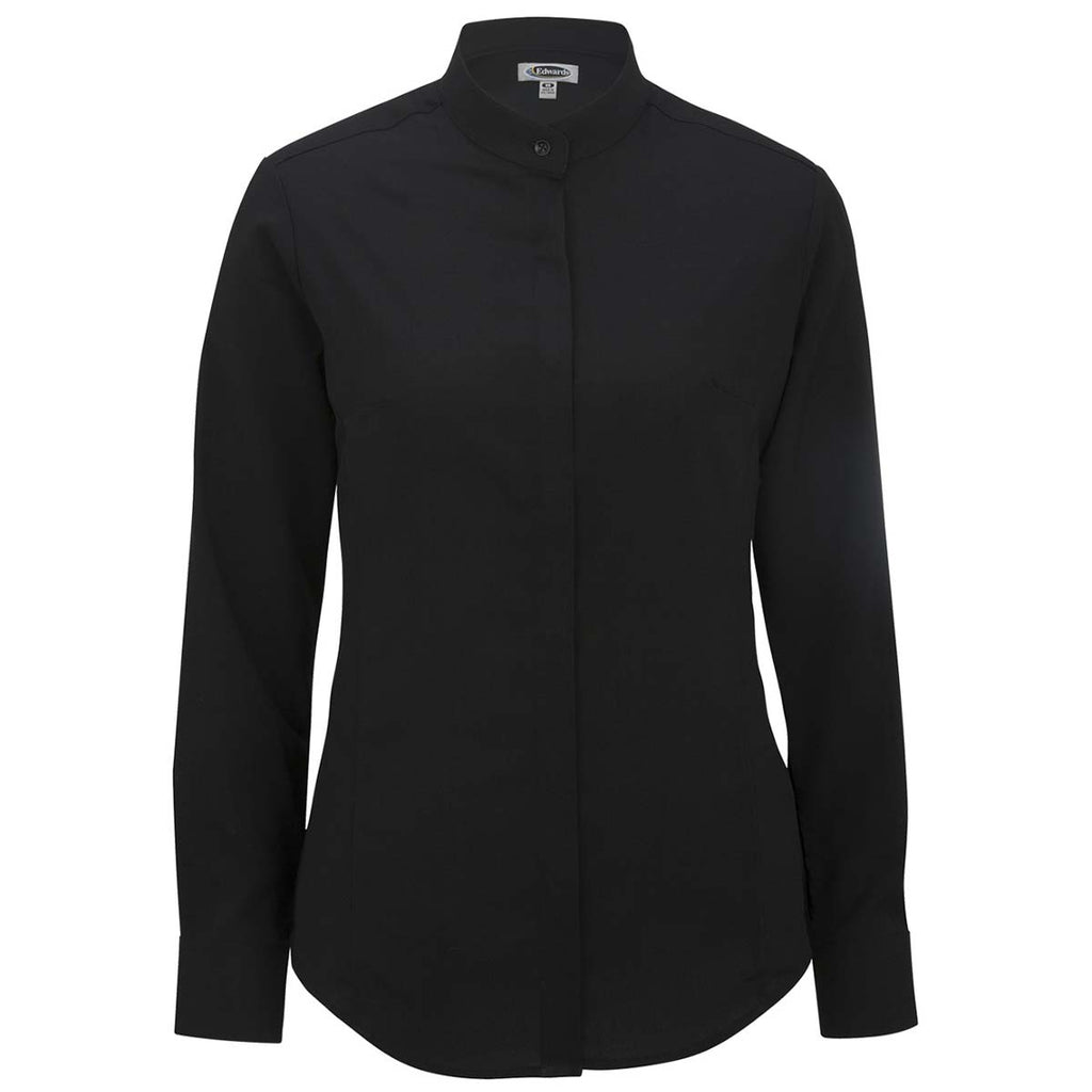 Enjoy all day custom comfort with the Edwards Women's Black Batiste Banded Collar Shirt with contemporary pattern accents on a soft, supple polyester fabric. The ideal choice for hospitality apparel for those working in resorts, hotels, or restaurants, this long sleeve dress shirt has a covered placket with unique banded collar that creates a flattering silhouette. Easy to laundry these shirts are wrinkle resistant, moisture wicking, and offer soil release in an easily embroidered material. Add your corporate embroidery or custom logo to improve employee visibility even at large events.Highlights