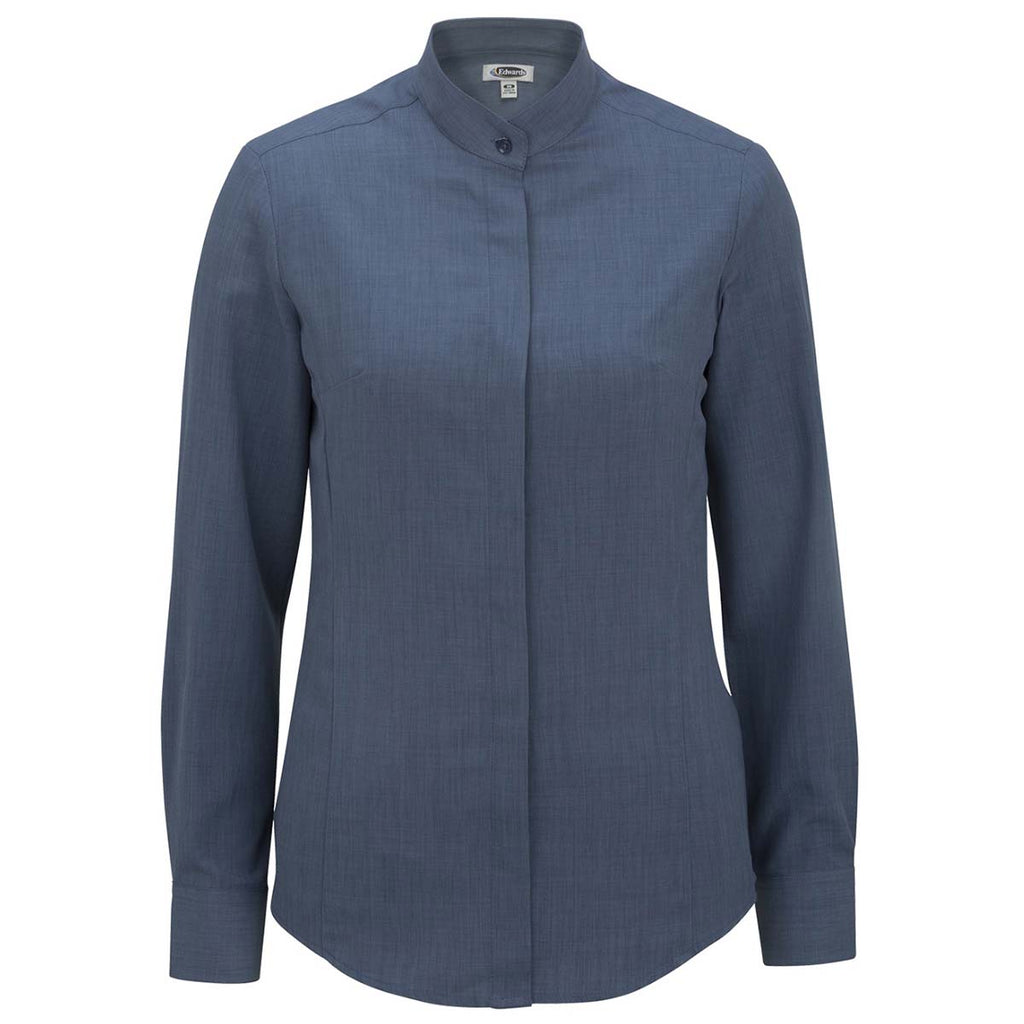 Enjoy all day custom comfort with the Edwards Women's Riviera Blue Batiste Banded Collar Shirt with contemporary pattern accents on a soft, supple polyester fabric. The ideal choice for hospitality apparel for those working in resorts, hotels, or restaurants, this long sleeve dress shirt has a covered placket with unique banded collar that creates a flattering silhouette. Easy to laundry these shirts are wrinkle resistant, moisture wicking, and offer soil release in an easily embroidered material. Add your corporate embroidery or custom logo to improve employee visibility even at large events.Highlights