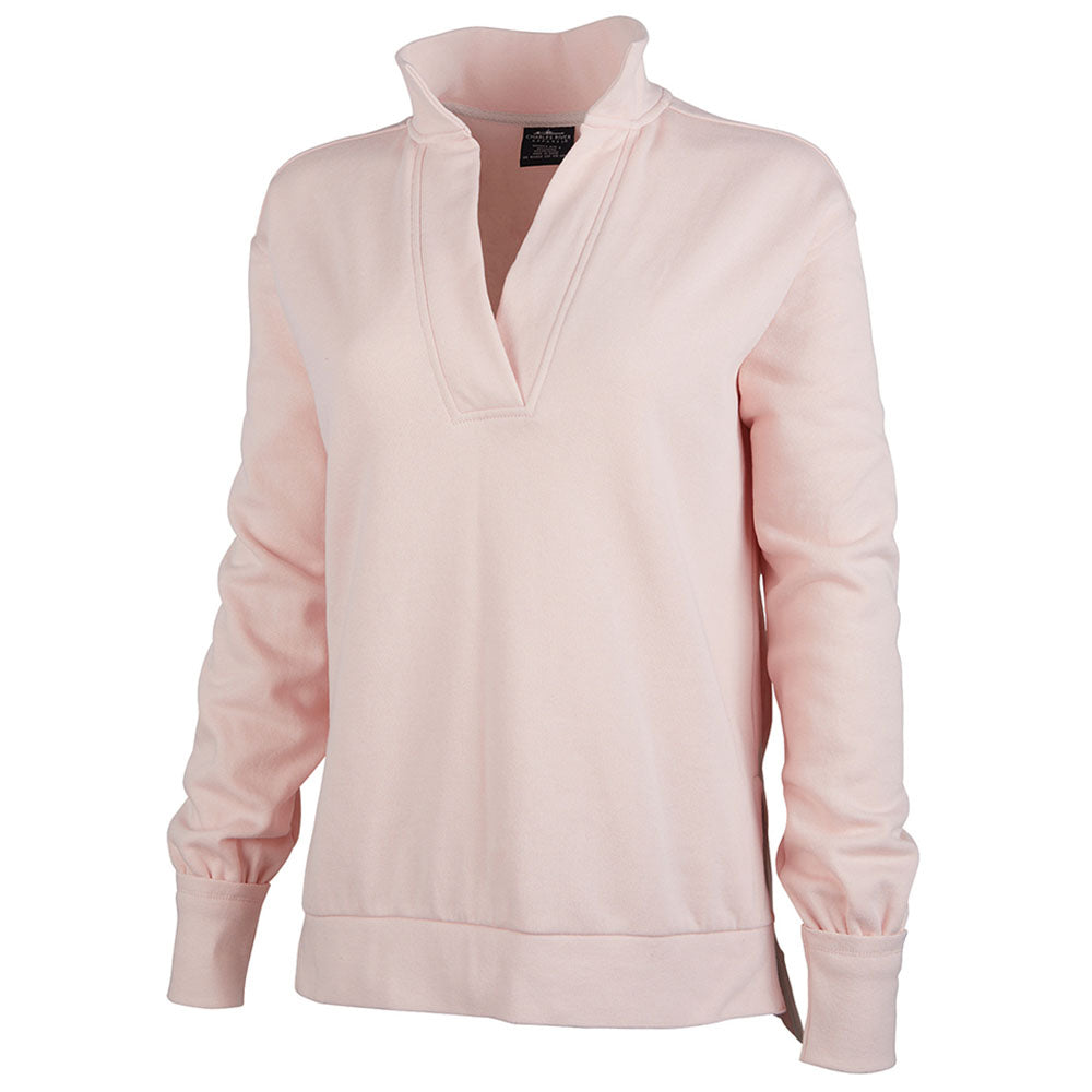 Add embroidery to the Charles River Women's Light Pink Coastal Sweatshirt for a fun and fashion-friendly look that is comfortable for all-day wear. The polyester fleece/cotton blend is used to create a V-neck sweatshirt with high-low hem and gathering around the yoke. Great as casual wear at home or on the go. Grab this sweatshirt and layer for travel or a quick nine holes at your favorite course. Order today.