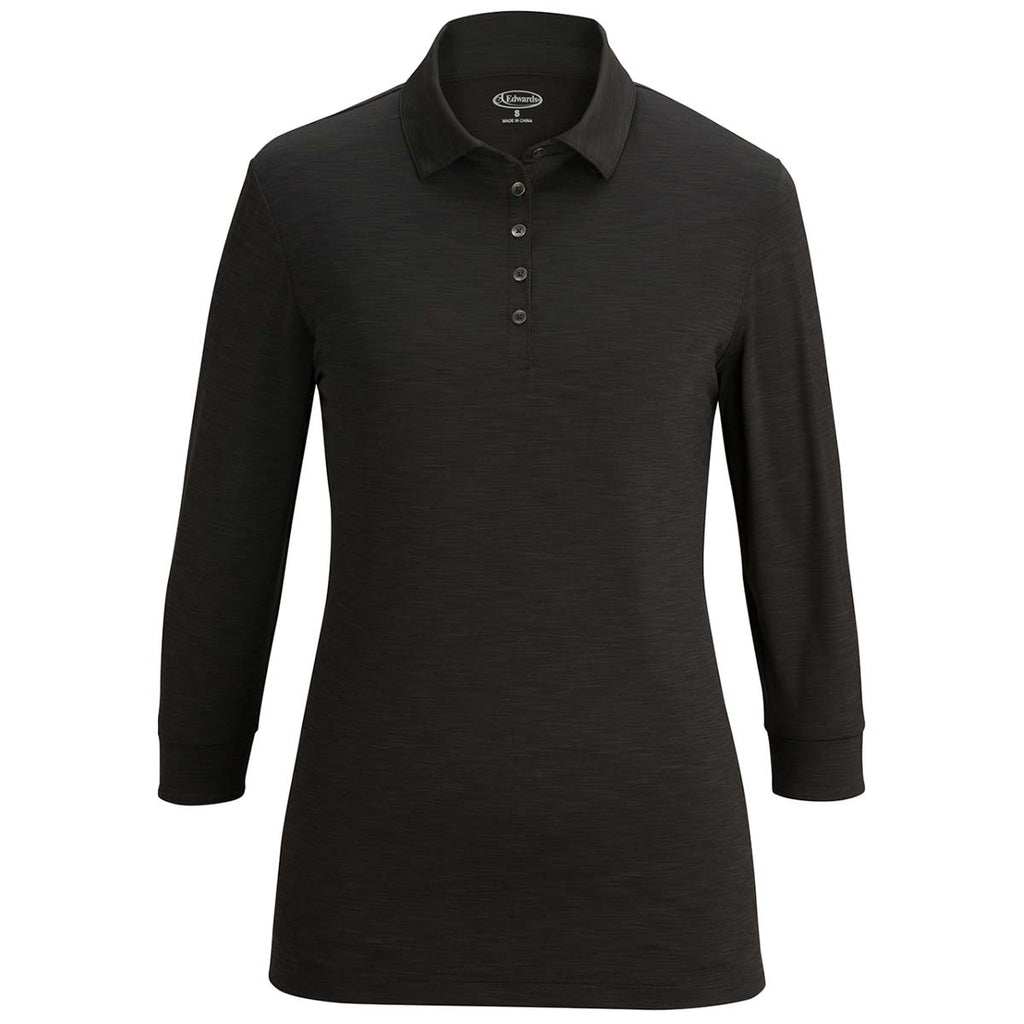 Hit the fairway in a custom Edwards Women's Black 3/4 Sleeve Optical Polo with 3-toned fabric and UV protection. Easily transition from the boardroom to the clubhouse in an embroidered optical polo with antimicrobial finish, metal button placket, and double-needle stitching. Add a company logo to use these polos as part of employee apparel although they are also perfect as corporate uniforms. Choose from one of the dark, basic colors and add your corporate embroidery so that all wearers will be easily recognized. Place an order for just a few or a large batch in the color and design of your choice before the next big event on the calendar.Highlights