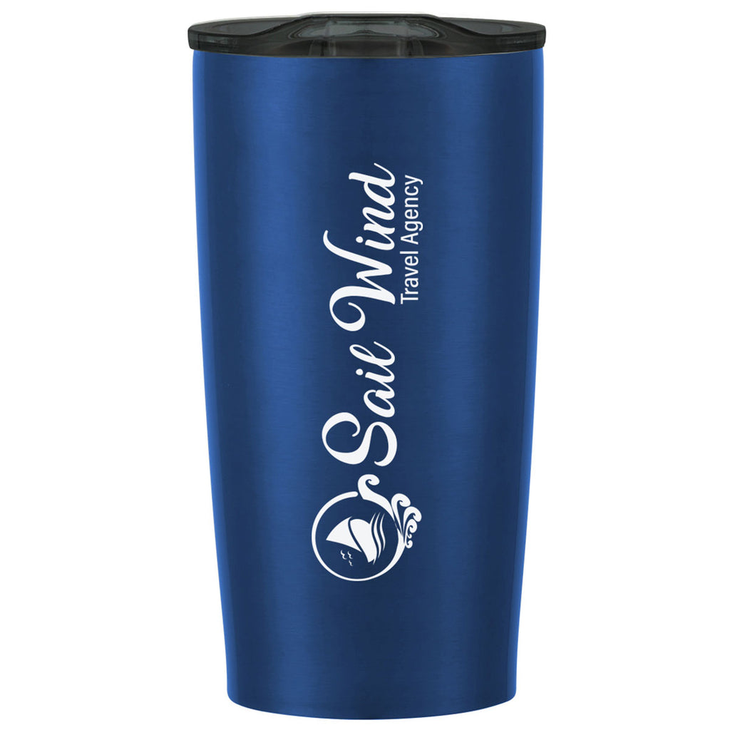 Hit Metallic Blue with Charcoal Lid 20 Oz. Himalayan Tumbler with a custom logo makes your morning commute and afternoon drink a bit easier to enjoy. The stainless steel tumbler has double wall construction and keeps drinks hot or cool for up to 6 hours as needed. Choose the color you prefer to create a personalized item for your company or event.