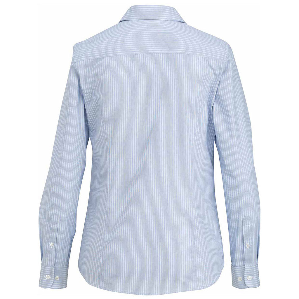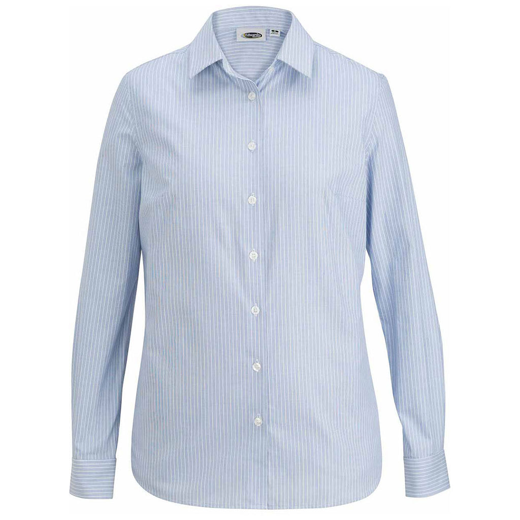 Choose your embroidery for the Edwards Women's Blue/White Stripe Pinpoint Oxford to enjoy a lightweight professional look that will turn heads. The tailored fitting oxford offers light stripes for an eye-pleasing look. Add a company logo to use as corporate apparel or as employee apparel that will have employees looking polished and professional. The wrinkle free fabric looks great even when your hours are long and the spread collar has permanent stays to maintain appearances. Princess back seams and a curved hem on the machine washable oxford gives this long sleeve shirt a feminine flair that can be worn alone or paired with a sweater or blazar.Highlights