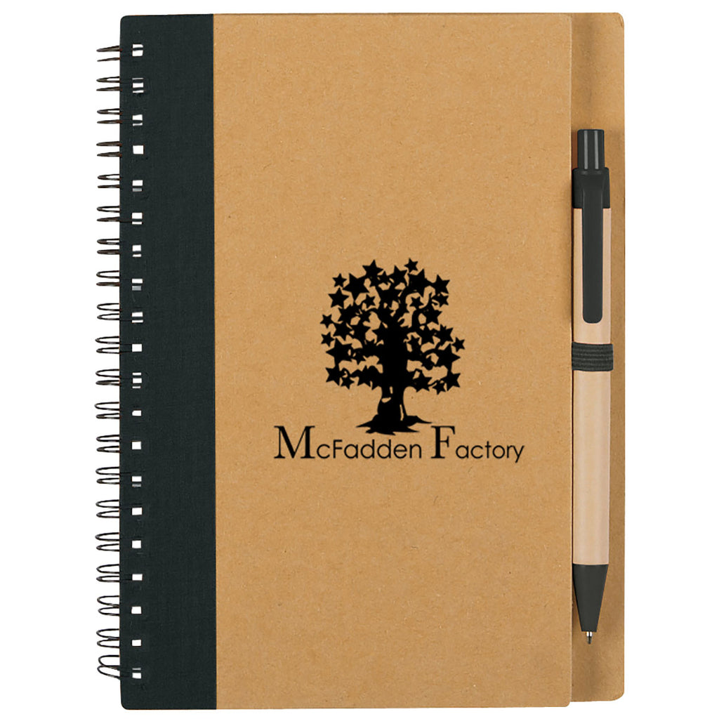 Choose your corporate design or logo for the Hit Natural/Black Eco-Inspired Spiral Notebook & Pen to give to new hires, share at meetings, or give away at networking events. The 80-page lined notebook has a matching pen with a paper barrel held in an elastic pen loop for organization. The cardboard cover is held closed with a band closure.
