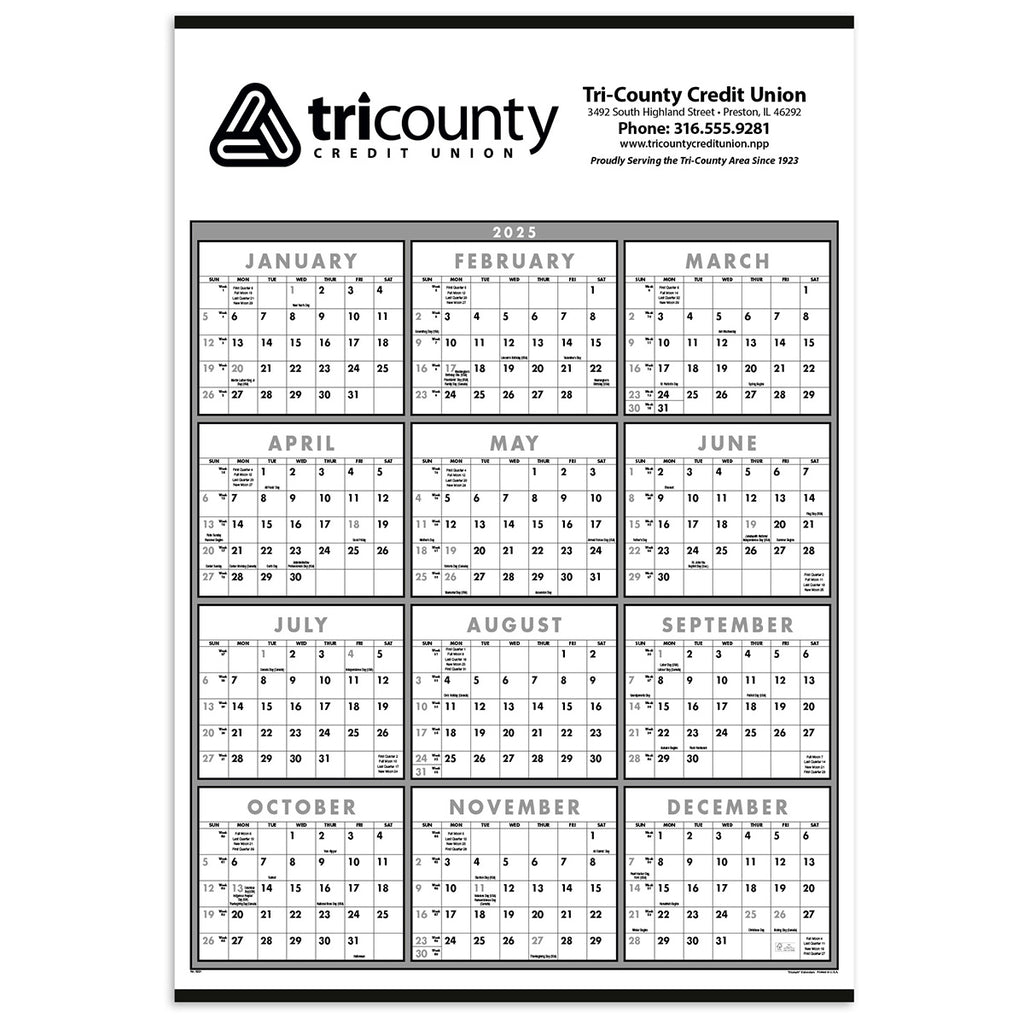 Triumph Calendars Black & White Black & White Span-A-Year Non-Laminated calendar with a custom logo is the best way to look at a full year at a glance. The single-page calendar shows every day for ease of scheduling and is made from well-managed FSC-certified forests and other sources. Great in a swag bag, at trade shows, and at other specialized events. Order today.The minimum order for this product is 100 pieces.