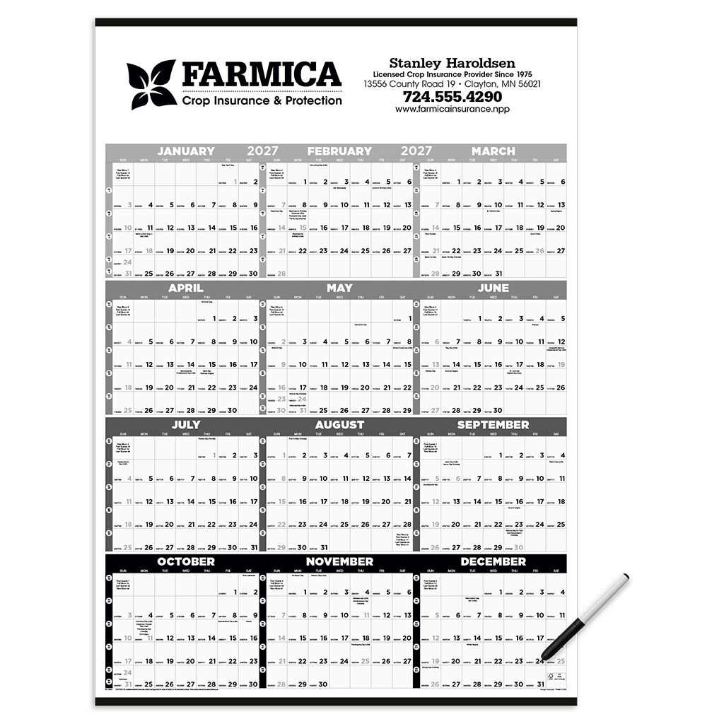 Triumph Calendars Black & White Black & White Time Management Span-A-Year Laminated calendar with a corporate logo is a fun and simple way to help keep clients, staff, and yourself organized. Your schedule can be found at a glance with this laminated calendar with a marker included but not attached. Place your order today.The minimum order for this product is 100 pieces.