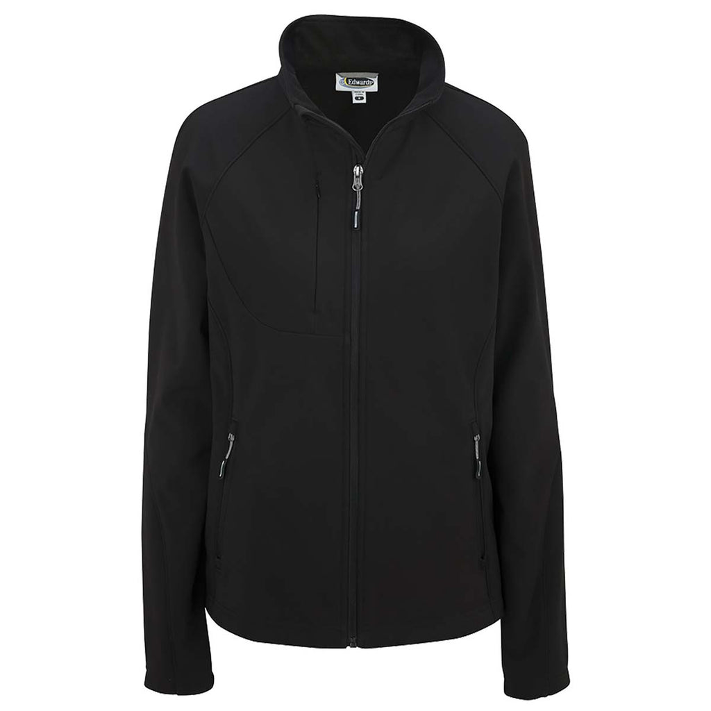 Stay protected when the weather starts to turn in a custom embroidered Edwards Women's Black Soft Shell Jacket in four color options. Add a company logo or team name to these polyester rich spandex jackets with microfleece inner layer for warmth. The lightweight jacket offers 3 layer bonded fabric for both protection and versatility in a wind and water resistant outer layer. Add your corporate embroidery to use these as part of employee apparel or as part of hospitality apparel for those who need to be outdoors, such as valets or attendants. The zippered front has zippered pockets and a full length wind guard and stand up collar with chin guard. Easy to machine wash for repetitive wear.Highlights
