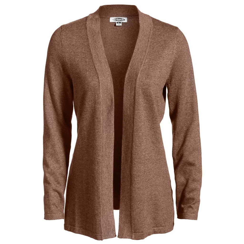Bring back a custom classic with the Edwards Women's Mocha Heather Open Cardigan available in multiple colors. Made of a blend of cotton, acrylic, and nylon with full fashioned sleeves, these cardigans offer a longer length and flattering silhouette that will be a big hit with a corporate embroidery in your choice of design. Use these as part of hospitality apparel or even corporate uniforms to create a classic, yet unique look for your company. Perfect for the office, the weekend, or a big event, these are easily used as an outer layer to add to any outfit.Highlights