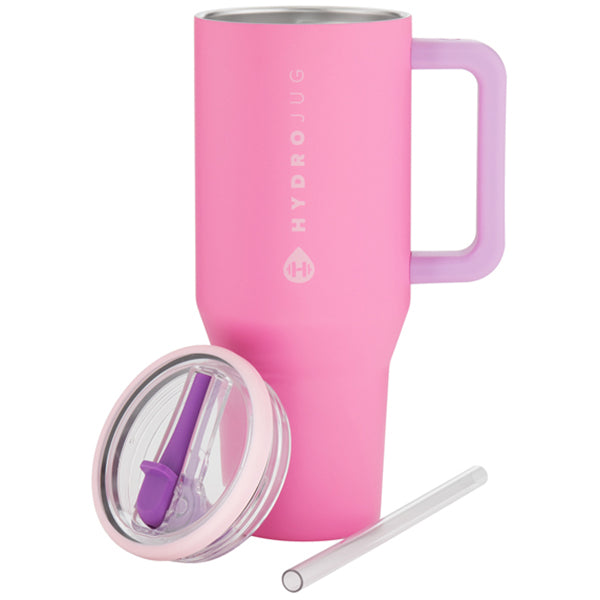 Choose a corporate design for the HydroJug Pink Sand 32oz Traveler to make sure your time on the road keeps you well hydrated. Simple fill with your favorite beverage, screw-on the threaded lid, and enjoy sips with the soft straw. The cup holder-friendly design and side handle make this easy to handle, even in the car.