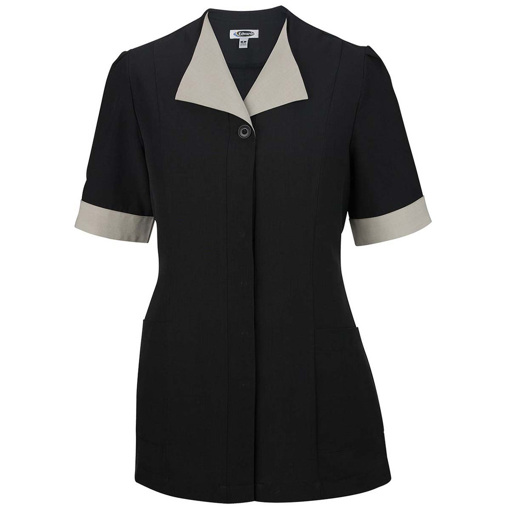 Employee apparel for housekeepers has never looked better than with the Edwards Women's Black Pinnacle Tunic Shirt in six color options with contrasting collar, cuff, and button placket. Created from 100% polyester, this tunic shirt has all the features needed for a long day of housekeeping duties. The low pill fabric that is shrink, wrinkle, and fade resistant means that even the worst jobs do not stand a chance with this corporate embroidered shirt. Excellent as part of corporate uniforms, these short sleeve, two pocket shirts are easily machine laundered so that they are ready for the next shift.