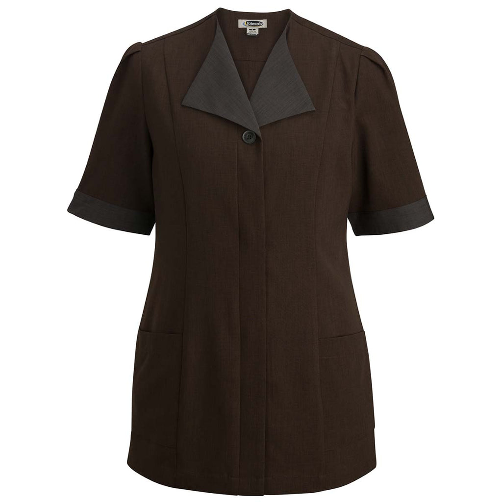 Employee apparel for housekeepers has never looked better than with the Edwards Women's Chocolate Pinnacle Tunic Shirt in six color options with contrasting collar, cuff, and button placket. Created from 100% polyester, this tunic shirt has all the features needed for a long day of housekeeping duties. The low pill fabric that is shrink, wrinkle, and fade resistant means that even the worst jobs do not stand a chance with this corporate embroidered shirt. Excellent as part of corporate uniforms, these short sleeve, two pocket shirts are easily machine laundered so that they are ready for the next shift.Highlights