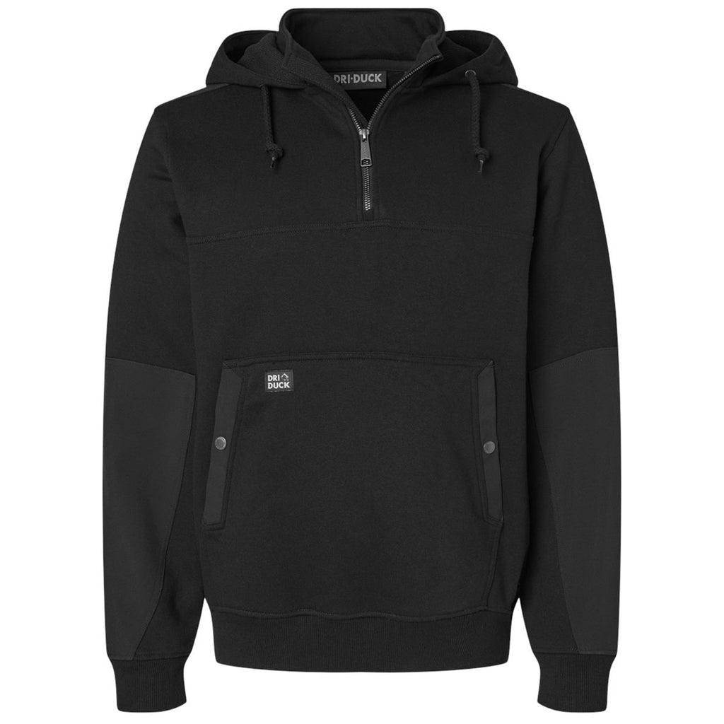 Choose a corporate or custom logo for the Dri Duck Men’s Black Mission Quarter-Zip Hooded Pullover for an easy to wear look that is also water-repellant. The pullover with a three-piece hood, snap closure, and front hand pockets is ideal for outdoor projects, daily wear, or as part of a corporate uniform.