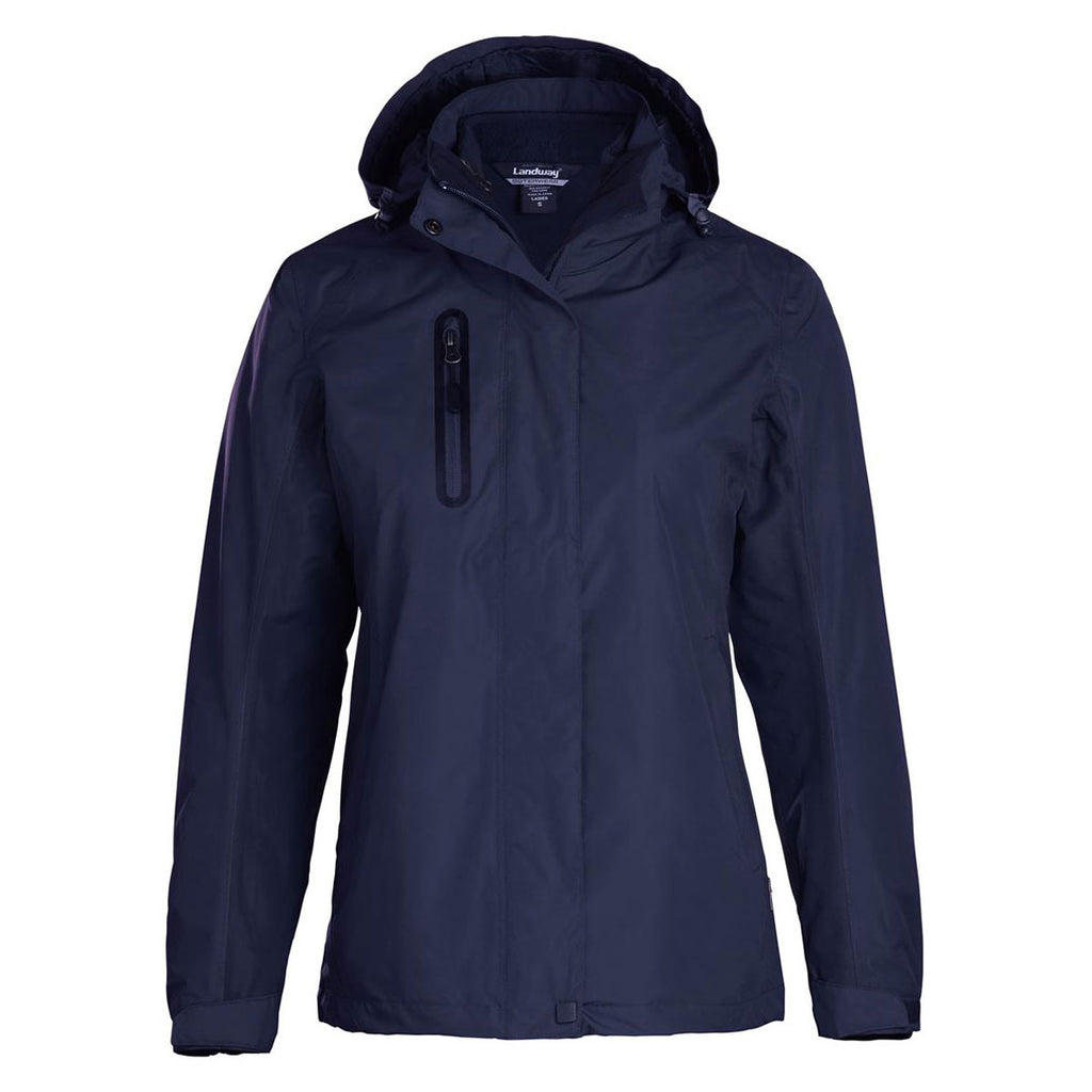 Discover your fashionable path by ordering the embroidered Landway Women's Navy Pathfinder 3-in-1 Parka. Designed with a full front storm flap and closure, the ultimate winter coat repels water to ensure you remain comfortably dry throughout a cold weather weekend camping trip. Polyester microfleece lining acts as an extra layer of insulation that traps body heat. Attach and zip up the three-panel hood to protect your head and neck from icy winter blasts. Adjustable cuffs prevent cold air from moving up the arms. Add a custom logo to turn the warm parka into a powerful marketing platform.Corresponding Men's Style: Landway Men's Navy Pathfinder 3-in-1 Parka
