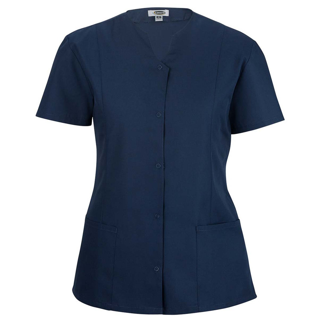 Be at the forefront of employee apparel with the Edwards Women's Vintage Navy Snap-Front Smock Shirt in vintage navy or black. Add a custom embroidery to the polyester cotton blend smock for your employees. Perfect for housekeepers, medical environments, and even spas, these short sleeve smocks offer two large patch pockets, princess seams with notch v-neckline for added appeal. Side vents at the hem mean movement is not hindered and the easily laundered smock can stand the test of time. Order several to use for hospitality apparel or general employee wear.
