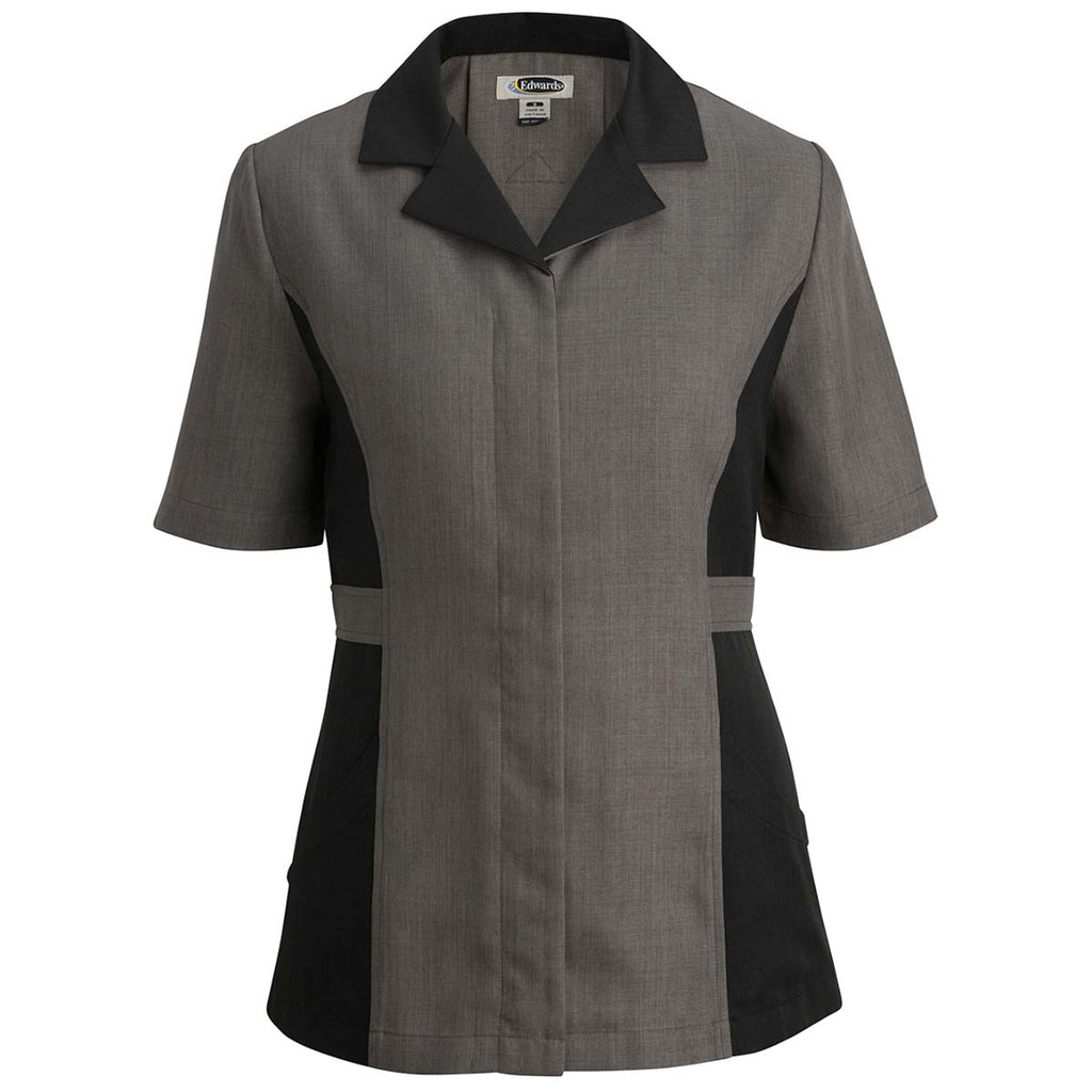 Employee apparel for housekeepers has never looked better than with the Edwards Women's Graphite Premier Tunic Shirt in six color options with contrasting collar and side panels for a fitted look. Created from 100% polyester, this tunic shirt has all the features needed for a long day of housekeeping duties. The hidden placket, deep hip pocket and accent belt on this corporate embroidered shirt offer a polished look. Excellent as part of corporate uniforms, these short sleeve shirts are easily machine laundered so that they are ready for the next shift.