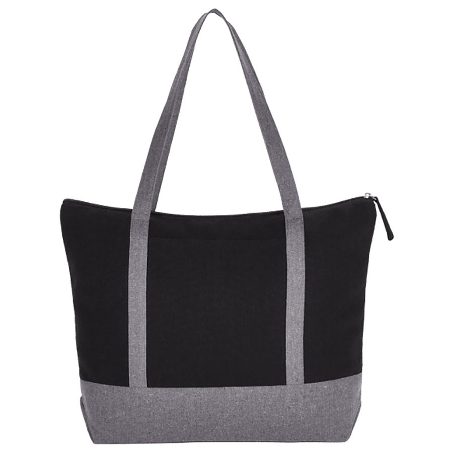 Upgrade your product lineup with the Repose 10oz Recycled Cotton Zippered Tote-an eco-friendly choice that combines sleek style with practical functionality. Crafted from durable 10oz recycled cotton, this black tote combines eco-friendliness with modern style. The larger zippered main compartment ensures secure storage, while the on-trend color-blocking design adds a fashionable touch. With a 10.5" handle drop and an 8" x 7.5" front slash pocket, it offers both convenience and functionality. The spacious size of 13.50" H x 18.25" W x 4.00" D makes it perfect for carrying a variety of items. Stock up now and offer your customers a tote that stands out for its durability and modern design, perfect for their local market needs!