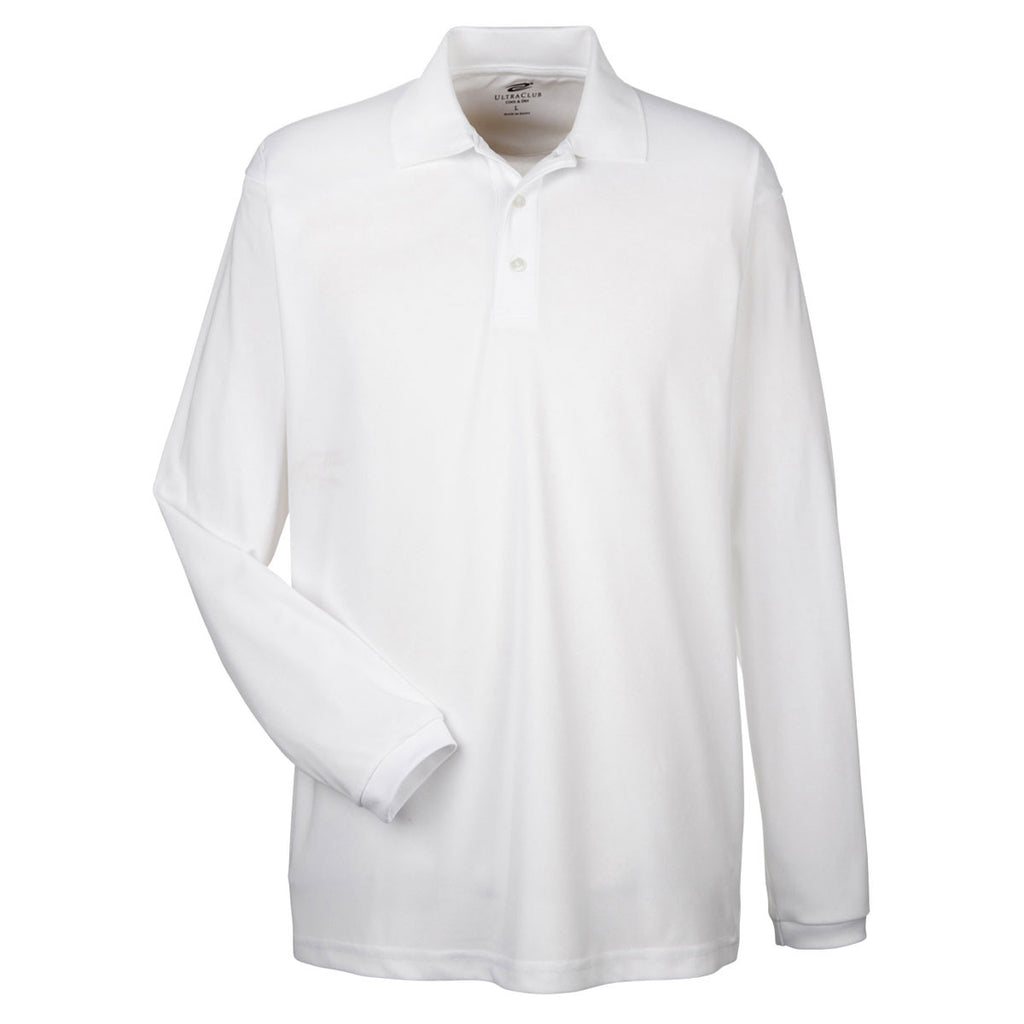 UltraClub Men's White Cool & Dry Long-Sleeve Mesh Pique Polo