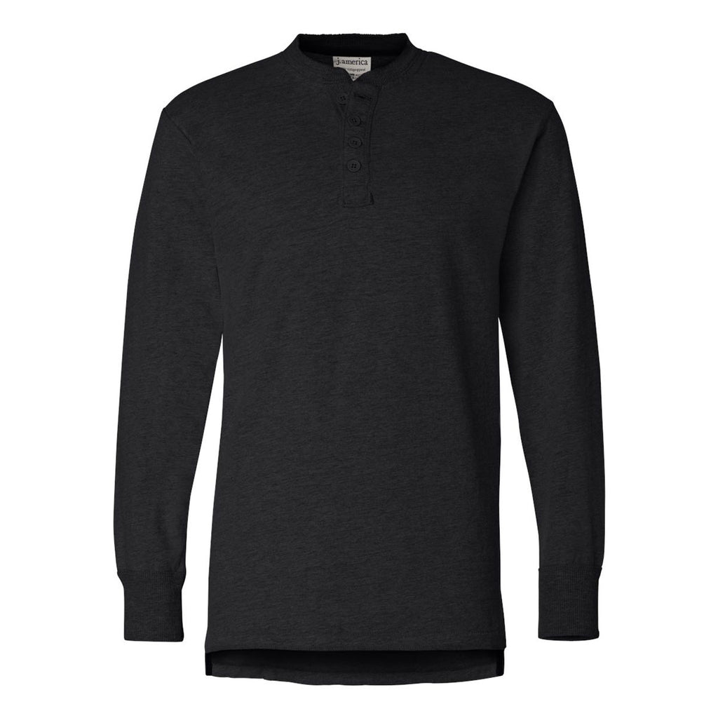 Add your company logo on the embroidered J. America Men's Black Vintage Brushed Jersey Henley. Custom logoed corporate apparel enhances your business image at business seminars and conferences. One-hundred percent brushed cotton bounces back from frequent use to give you years of high-quality performance. Split side vents complement the chic design of the four-button placket to give you a go to shirt for all occasions. Wear the versatile Jersey Henley to the office and keep it on after five o'clock to kick back with your professional colleagues. Two by one rib cuffs present a dignified look worthy of a professional who takes charge of company projects.Highlights